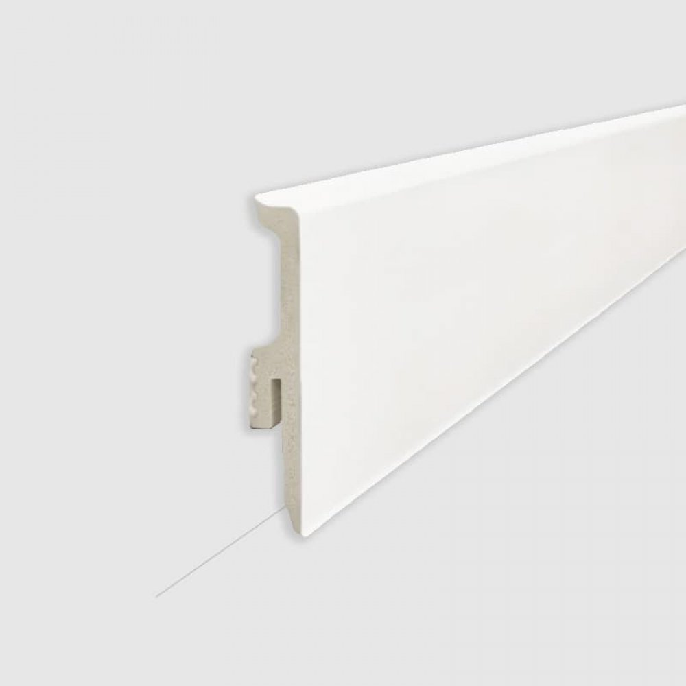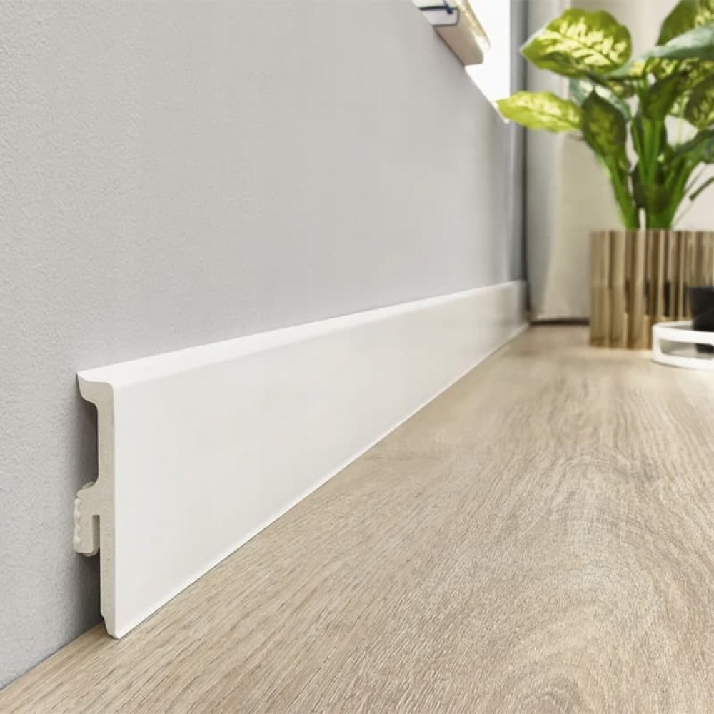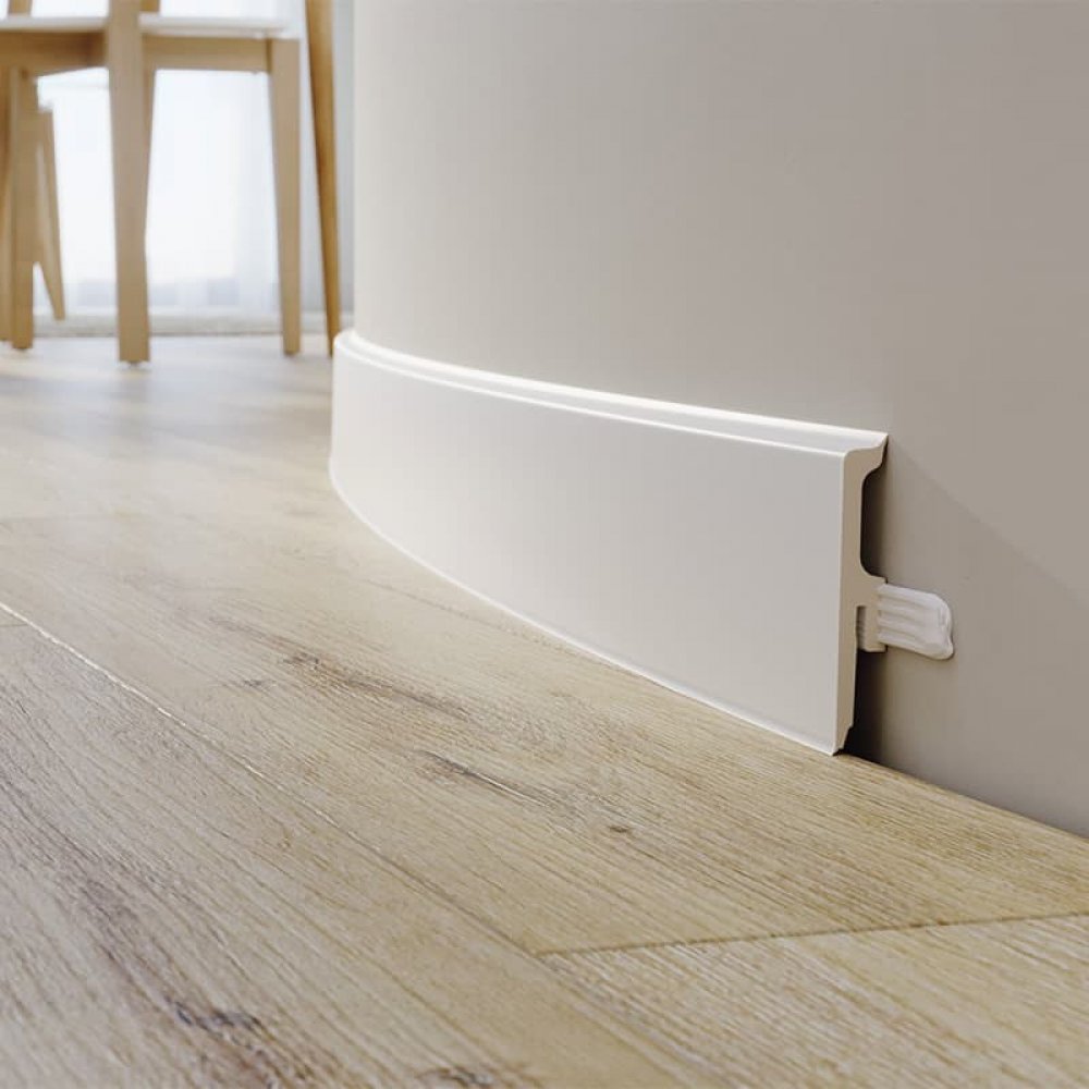 Univerzální soklová lišta bílá (vzorník RAL 9003) je ohebná, voděodolná, při instalaci není potřeba silikon. Montáž soklové lišty se provádí na klipsy nebo lepením, „na pokos“ nebo s komponenty. Klipsy se prodávají po baleních, které obsahuje i hmoždinky (20 + 20 ks v balení), montují se cca 50 cm od sebe.
