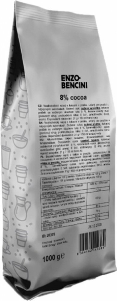 ENZO BENCINI 8% cocoa je nealkoholický nápoj s kakaem v prášku mléčno-kakaové chuti s bohatou pěnou, určený pro použití v nápojových automatech, obsahuje 8% odtučněného kakaového prášku.