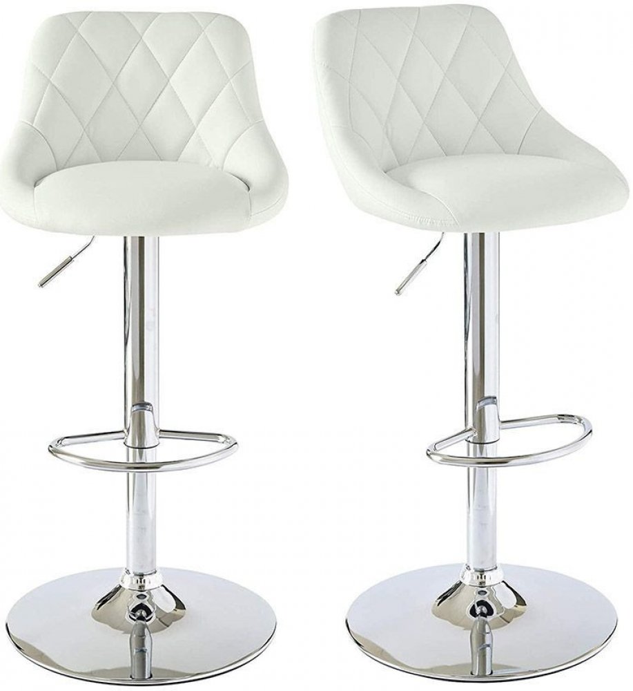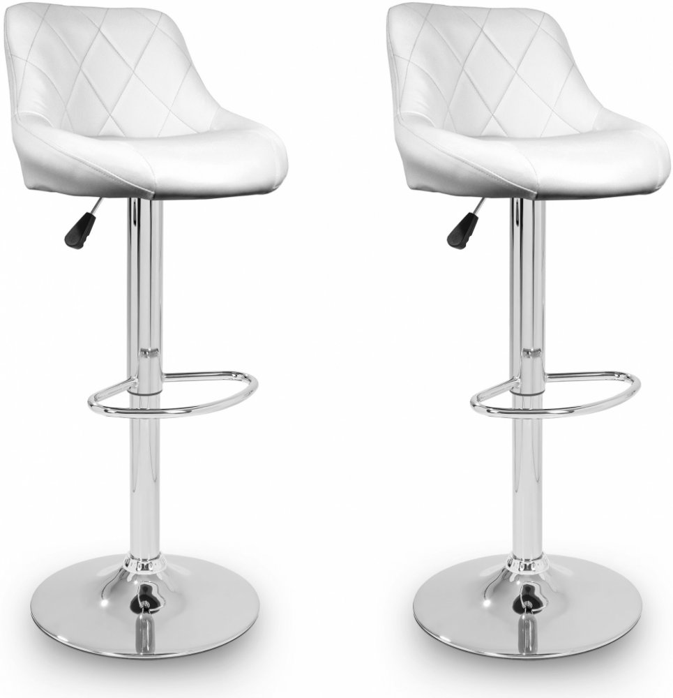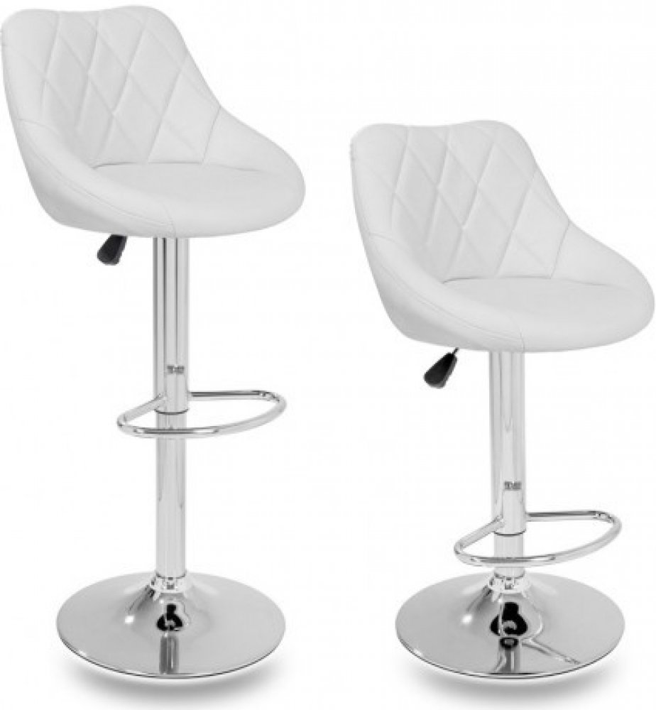 Tato sada dvou bílých barových židlí ze syntetické kůže v moderním designu skvěle doplní Váš interiér. Díky mechanismu s plynovým pístem lze nastavit výšku jejich sedáku. Každá židle disponuje chromovou podnožkou, která vám zaručí pohodlné posezení. Opěradlo sedadla je ergonomicky tvarované.