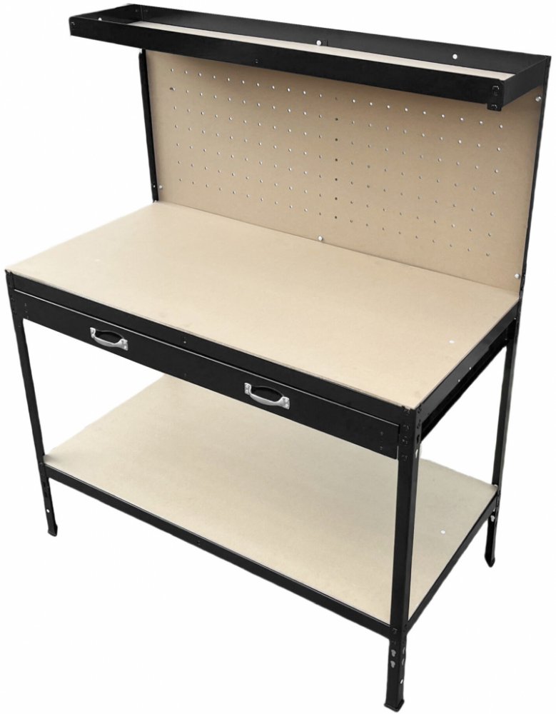Stůl je vybaven jedním prostorným šuplíkem s nosností 10 kg, který je ideální pro uložení drobného nářadí a příslušenství. Spodní polička poskytuje další úložný prostor pro větší předměty, jako jsou krabice s nářadím nebo materiály, které potřebujete mít po ruce.