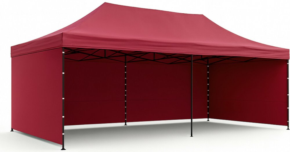 Konstrukce je vyrobena z práškově lakované oceli se šroubovanými spoji, které dodávají stánku stabilitu a pevnost i při častém používání. Patky na nohách umožňují bezpečné ukotvení k povrchu. Součástí provedení je také středová noha, která rovnoměrně rozkládá zatížení konstrukce, zvyšuje stabilitu a snižuje průhyb střechy u velkého rozměru 3×6 m.