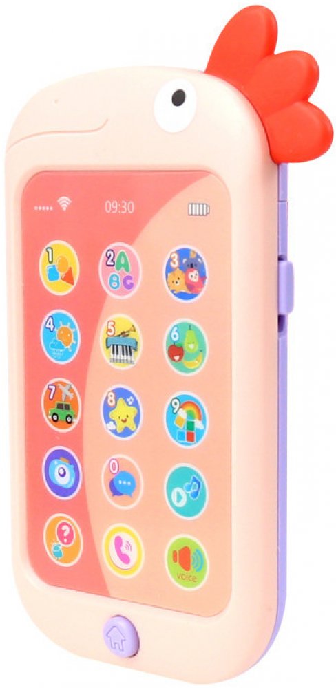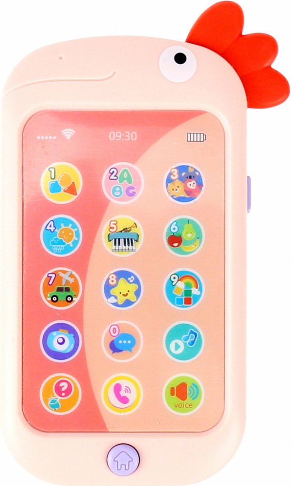 Dětský telefon v podobě kohouta je vybavený 15 obrázkovými tlačítky s různými funkcemi.