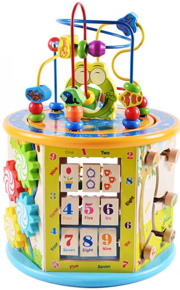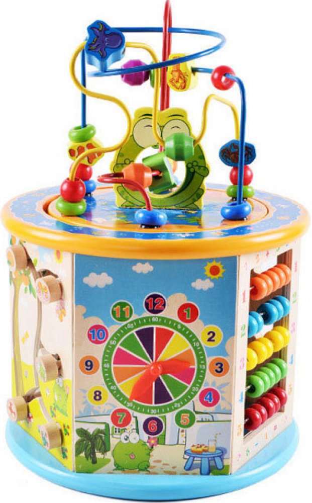 Motorická kostka ze dřeva nabízí zábavu při hraní z pěti stran. Otáčecí kostky s čísly a obrázky, vsazování správných tvarů, pohyblivé obrázky ve vyřezané trase z boku kostky, počítadlo, ozubená kolečka a hodiny.