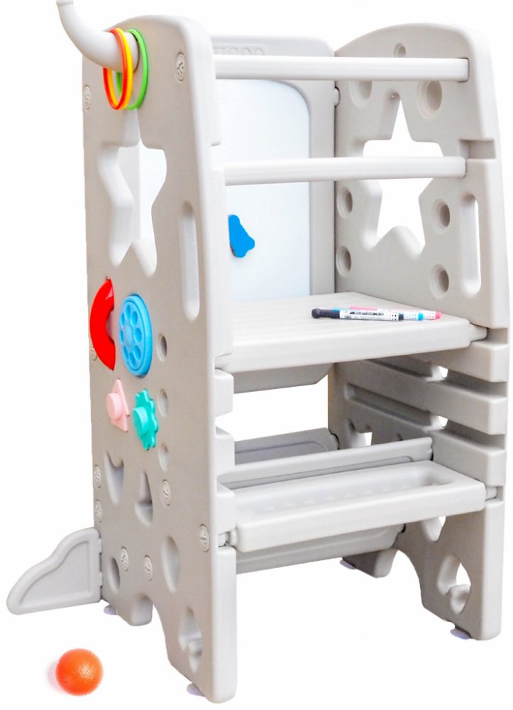 Rostoucí učicí věž Aga4Kids DS4201 je skvělým pomocníkem do domácnosti, který vašemu dítěti pomůže pozorovat a účastnit se různých činností v kuchyni i mimo ni. Dětem tato věž v neutrální šedé barvě umožní učit se novým dovednostem díky pozorování, napodobování a pomáhání při různých činnostech rodičů, ať již na kuchyňské lince, v koupelně či na pracovním stole. Děti také díky této věži dosáhnou na výše položené předměty, což podporuje jejich samostatnost. Využijete ji při vaření, pomáhání v dílně, čištění zubů a mytí rukou a obličeje i při mnoha dalších činnostech. Bezpečný vstup na věž zajišťuje 12 cm vysoký první schod i protiskluzová úprava nožiček. Plošina věže je výškově nastavitelná, takže tento pomocník poroste s vaším dítětem. Věž je vyrobena z vysoce kvalitního plastu, který je bezpečný, odolný, ekologický a zároveň se dobře udržuje. Vedle učicí funkce věž nabízí také interaktivní prvky, kterými jsou tabule na kreslení a basketbalový koš, kolíček pro házení kroužků a otočná ozubená...