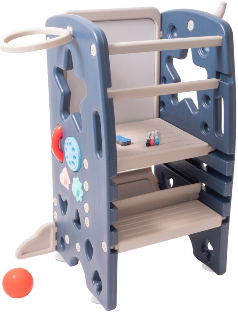 Rostoucí učící věž Aga4Kids pomáhá dětem povyrůst. Umožní dětem učit se novým dovednostem a zdokonalovat je při pozorování a napodobování každodenních činností v kuchyni i mimo ni.Děti pomocí věže budou moci vystoupat do výšky, z níž dosáhnou na kuchyňskou linku či pracovní stůl. Díky ní děti také dosáhnou na své oblíbené hračky a jiné předměty, učí je tak rovněž větší samostatnosti.Dítě může vylézt na výukovou věž samostatně, schod od podlahy je ve výšce 12 cm, což pomáhá dítěti dostat se na věž bezpečně. Učící věž nevyužijete pouze v kuchyni, ale i při dalších činnostech jako je čištění zubů, mytí rukou, pomáhání tatínkovi v dílně nebo při podávání hraček, které jsou v horních policích.Jedním z hlavních prvků této učicí věže je tabule na kreslení, která poskytuje dětem prostor pro vyjádření jejich kreativity. Tabule je dodávána se třemi fixy, které umožňují dětem kreslit, psát a mazat podle libosti. Tato aktivita nejenže podporuje jemnou motoriku, ale také rozvíjí jejich představivost.Pro malé sportovce je učicí věž vybavena basketbalovým košem a míčkem. Tato funkce přináší do dětského pokoje kousek sportovního hřiště a umožňuje dětem rozvíjet své pohybové dovednosti a koordinaci.Učicí věž je vyrobena z vysoce kvalitního HDPE plastu, který je známý svou odolností a bezpečností. Tento materiál je nejen ekologický, ale také snadno udržovatelný, což zajišťuje dlouhou životnost produktu.Specifikace dětské učící věže.Vlastnosti a funkce:Ideální pro použití v kuchyni, koupelně, dílně i dětském pokojiUmožní dětem učit se novým dovednostem a zdokonalovat jeVěž má protiskluzové nohy(EVA)Dětská učící věž má výškově nastavitelnou plošinu (30/40/50 cm)Zaoblené hrany konstrukce - věž nemá žádné ostré rohyPoužívejte pouze pod přímým dohledem dospělýchParametry:Materiál: HDPE plastRozměry: 90 x 46,5 x 46,5 cm (VxŠxH)Výška plochy ke stání: 30/40/50 cm (výškově nastavitelná)Výška schodu od země: 12 cmNosnost:90 kgVhodné pro děti od: 1,5 rokuVýrobce: Aga4Kids