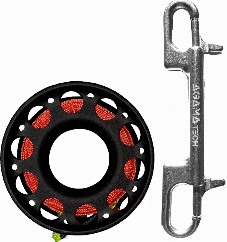 Součástí cívky na potápění je nerezová dvojitá karabina Agama TECH z oceli o velikosti 120 mm s dvěma oky.