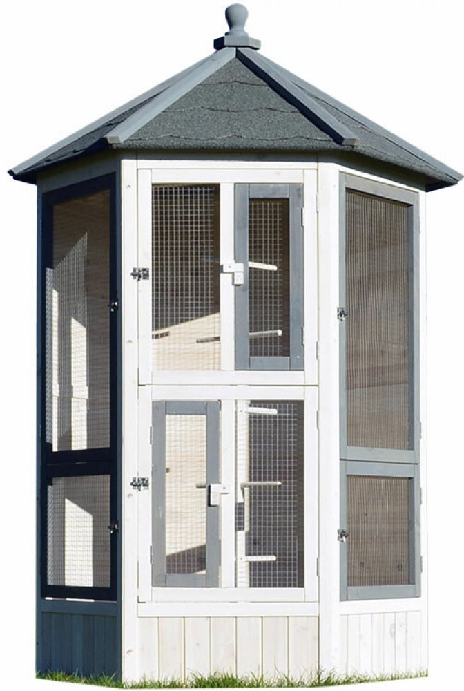 Velká voliéra s výběhem z kvalitního jedlového vysušeného dřeva pro papoušky, hlodavce i kočky. Velmi prostorná. Rozměry: šířka 224cm, hloubka 110cm, výška 183cm.