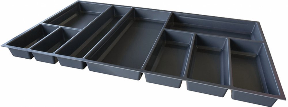 Příborník Sky 90 pro přehledné uspořádání příborů a kuchyňského náčiní. Kombinace pevných přihrádek a pohyblivých přepážek (k dokoupení zvlášť). Pro různé typy zásuvkových systémů - StrongMax, Legrabox, nebo i jiné typy (rozměry možno přizpůsobit ořezáním).Příborníky jsou rozměrem připraveny pro zásuvky s tenkými bočnicemi (StrongMax, Blum Legrabox). V rozměrech od 40 do 1200 mm šířy skříňky. Lze je vzájemně kombinovat a spojovat (možno dokoupit spojovací profil). K bočnici přilehnou přesně díky ukončovacímu profilu. Je tu i možnost doplnit o držák nožů, řezačku folii a také o další posuvné přepážky pro personalizaci podle přání zákazníka.