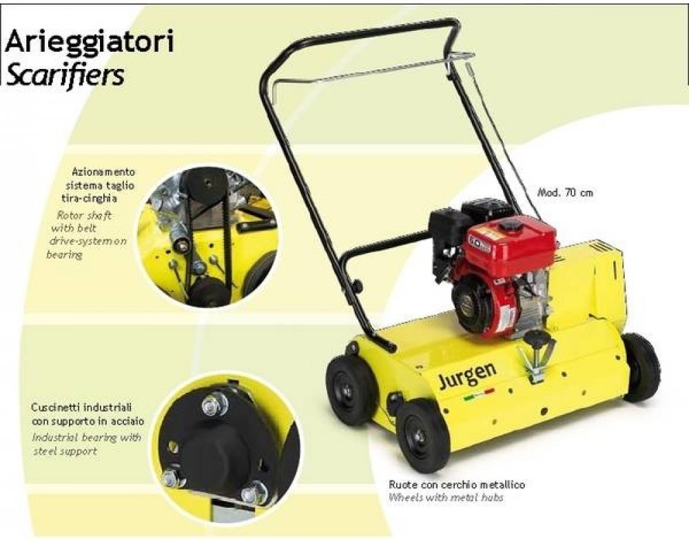 Výrobek Italské firmy, vyrábějící různé stroje již od druhé světové války. Poslední dobou se výroba ubírá směrem k široké řadě vertikutátorů, štěpkovačů, vysavačů a drtičů. Hlavním cílem společnosti je kvalita, flexibilita s důrazem na požadavky zákazníka.Žlutá řada výrobků je zaměřena na zákazníka, který potřebuje používat stroje ke své obživě(profi). Vyžaduje kvalitní, robustní, jednoduchý stroj s dlouhou životností , servisním zázemím a jistotou náhradních dílů. Tento stroj není vybaven pojezdem. O pohyb stroje vpřed se postará sámotný mechanismus prořezávání trávníku, který se doslova od trávníku odráží a tím uvádí celý stroj do pohybu. Tato síla je příjemná pro obsluhu, ale nijak velká, aby obtěžovala držením a přibržďováním celého stroje. To co se ušetřilo na pojezdu, bylo investováno do robustnosti, kvality použitého materiálu a tedy celkové materiálové výdrži stroje. Umístění motoru na stroji je v těžišti celého stroje, což přínáší hlavně nižší námahu a příjemnější ovládání pro obsluhu.Uložení nožů: 48ks tloušťky 2,5mm, 40mm od sebe(standard) nebo 60 ks tloušťky 1,2mm, 30 mm od sebe(na přání) VLASTNOSTI:Pohodlné nastavení výškyPrůmyslová ložiska s ocelovou podporouPohyblivé nožeNože z kalené oceli: 2,5 mm standardní / volitelný 1,2 mmKola s kovovým diskem Baleno v jedné krabici: 79x69x72 cm