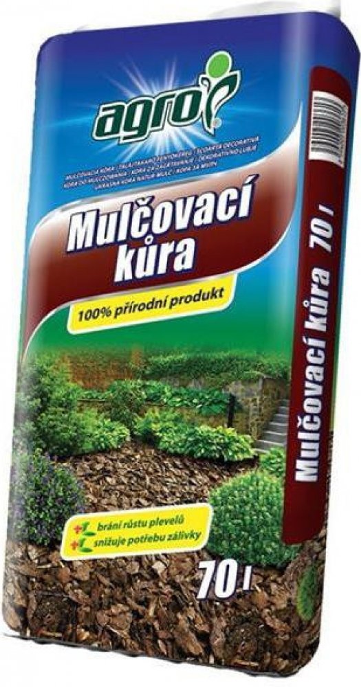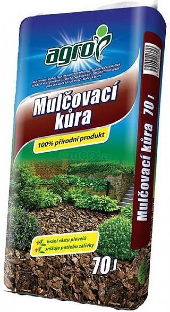 Kůra mulčovací AGRO 70L AGRO Mulčovací kůra je 100% přírodní materiál určený především k mulčování záhonů, kde zabraňuje růstu plevelů a odpařování vláhy z půdy. Dále slouží výborně k vysypávání cest, oddělování záhonů, pokrytí půdy okolo okrasných a ovocných stromů, na úpravu dětských hřišť a koutků. Mulčovací kůra je směsí, v níž je zastoupena drcená a tříděná kůra jehličnatých stromů.- 100% přírodní materiál, ekologicky nezávadný- Obsah jednoho pytle (70 L) vystačí při dodržení doporučené výšky vrstvy 4-6 cm na cca 1,5 m2