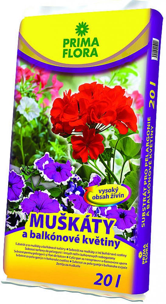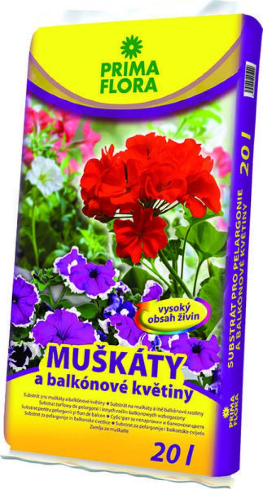 PRIMAFLORA Substrát pro pelargonie a jiné balkónové květiny je základní pěstební substrát s vysokým obsahem živin. Používá se pro pěstování muškátů a dalších jiných balkónových květin, jako jsou petunie, surfinie, verbeny, begonie, fuchsie a další.