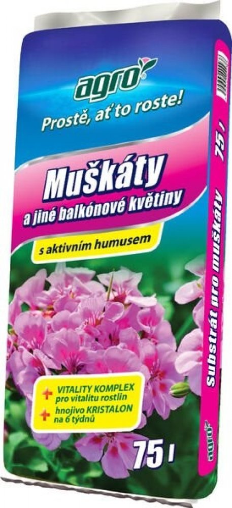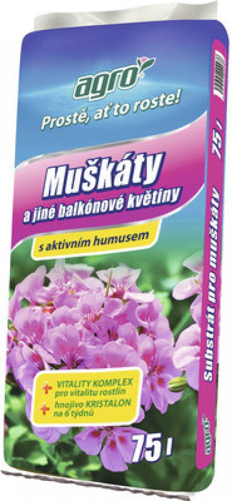 AGRO Substrát pro muškáty a jiné balkónové květiny je směsí rašeliny, kvalitního vyzrálého humusu a jílu. Má upravené pH pro potřeby balkonových květin a dále obsahuje: