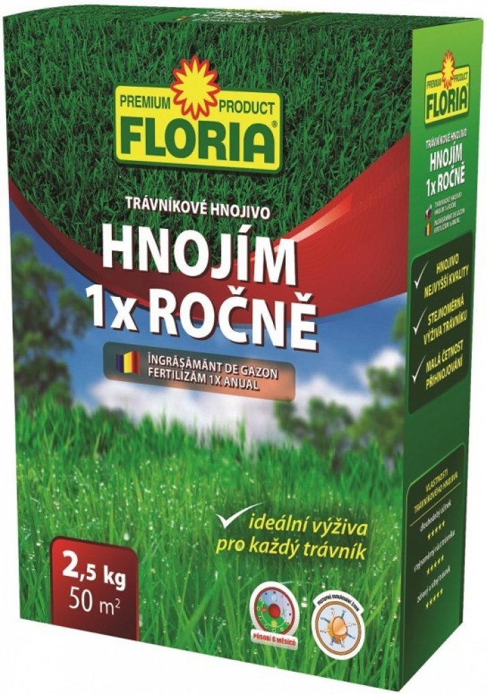 Charakteristika přípravku Trávníkové hnojivo HNOJÍM 1x ROČNĚ se vyznačuje vysokou kvalitou a špičkovým zpracováním surovin. Je zárukou profesionálních výsledků v péči o trávník. Dlouhodobě působící trávníkové hnojivo kontrolovaně uvolňuje živiny do půdy a poskytuje kořenům trav dávky živin přesně v takovém množství, které je třeba pro sytě zelený a hustý trávník. Délka účinku je závislá na teplotě. Při teplotě půdy kolem 21°C působí hnojivo 6 měsíců. Benefity hnojiva:- jedna aplikace za 6 měsíců- ztráty živin vyplavováním jsou omezeny na minimum- vyrovnaný růst trávníku Návod k použití Aplikaci hnojiva provádějte na jaře, hned po vertikutaci anebo 1 až 2 dny po sečení. Granule rovnoměrně rozhoďte na oschlý trávník, na větší plochy použijte posypový vozík. Hnojení provádějte od dubna do května. Živiny se z hnojiva budou kontrolovaně uvolňovat až do konce srpna. Potom přejděte na podzimní trávníkové hnojivo, které zvýší odolnost trávníku proti vymrzání - doporučujeme Trávníkové hnojivo PODZIM . Hnojivo je vhodné také pro přípravu půdy před výsevem. počet aplikací / rok: max 1x po vertikulaci nebo před přípravou půdy pro výsev - březen / duben - 50 g/m² sezónní hnojení - duben / květen 50 g/m² Po aplikaci hnojiva je vhodné plochu dostatečně zavlažit. První pomoc při zasažení Všeobecné pokyny: Pokud se při práci s výrobkem objeví projevy, které je nutné řešit ve spolupráci s lékařem, informujte lékaře o názvu výrobku a o jeho dodavateli nebo poskytněte lékaři označení výrobku uvedené na obalu. Při nadýchání: Vyvést na čerstvý vzduch.Při styku s kůží: Odložit znečištěný oděv a ochranné pomůcky. Omýt velkým množstvím vody.Při zasažení očí: Rozevřít oční víčka a vypláchnout velkým množstvím vody. Pokud by po výplachu očí přetrvávaly intenzivní pocity a projevy jejich podráždění, doporučuje se vyhledat lékařskou pomoc.Při požití: Vypláchnout ústa. Vypít větší množství vody (0,5 l). Nevyvolávat zvracení. Pokud by se po požití výrobku objevily příznaky vážnějšího podráždění zažívacích orgánů nebo nevolnost, je vhodné vyhledat pomoc lékaře. Skladování přípravku výrobek skladujte na suchých, v původním uzavřeném obalu, mimo dosah dětí. Složení poměr živin: dusík - fosfor - draslík 25-05-3 + 3 MgO Doba použitelnosti neomezená Balení 2,5 kg vystačí na 50 m2 Upozornění související s bezpečností Uchovávejte mimo dosah dětí. Je třeba zachovávat běžné zásady osobní hygieny a bezpečnostni práce. Používejte biocidy bezpečným způsobem. Před použitím si vždy přečtěte označení a informace o přípravku. Nekopírujte texty ani fotografie.Tento text je chráněn autorským zákonem. K jeho použití potřebujete předchozí písemný souhlas redakce webu www.potapnicek.cz