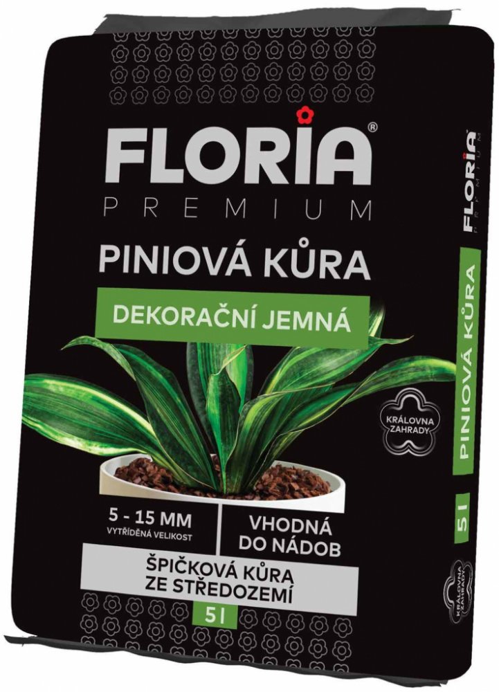 Piniová dekorační jemná kůra FLORIA PREMIUM FLORIA PREMIUM Piniová dekorační kůra jemná je vysoce kvalitní materiál, který je vyráběn z kůry borovice pinia, dovezené přímo ze Středomoří. Tento produkt zaručuje profesionální výsledky v péči o rostliny a přináší estetický i praktický přínos do každé zahrady nebo interiéru. VÝHODY - Atraktivní vzhled a dlouhá trvanlivost - piniová kůra má krásný přírodní vzhled, který vydrží dlouhou dobu, a tak zůstává stále esteticky přitažlivá - Udržení vlhkosti - kůra pomáhá zamezit výparu vody z půdy, čímž udržuje vlhkost a snižuje potřebu častého zalévání - Ochrana proti plevelům a plísním - tento materiál snižuje výskyt plevelů a plísní na povrchu substrátu, čímž usnadňuje údržbu a podporuje zdraví vašich rostlin - Frakce 5-15 mm NÁVOD K POUŽITÍ Ideální pro pokrytí povrchu půdy v květináčích a nádobách s pokojovými rostlinami, do truhlíků na terasách a pro zdobení a ochranu pěstovaných rostlin, pro celoroční použití ať už v interiéru nebo v exteriéru. Na připravený, zbavený plevelů a urovnaný povrch půdy rovnoměrně nasypte vrstvu jemné piniové dekorační kůry o tloušťce 2-3 cm. Vytvořte krásnou a zdravou zahradu nebo interiér s FLORIA piniovou dekorační kůrou - ideální pro všechny, kdo chtějí kombinovat krásu přírody s praktickými výhodami pro své rostliny.