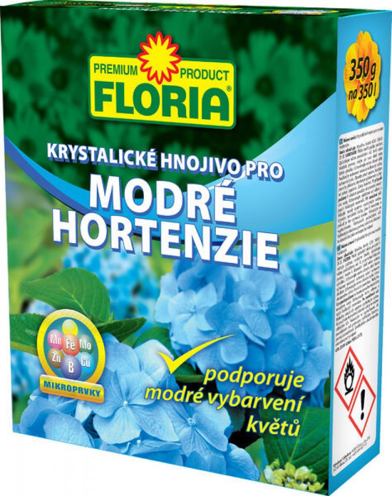 FLORIA Krystalické hnojivo pro modré hortenzie je velmi účinné a rychle působící vodorozpustné hnojivo. Zásobuje rostliny všemi důležitými živinami a mikroprvky v takovém poměru, který splňuje nároky hortenzií. Hnojivo je vhodné pro všechny druhy hortenzií pěstovaných v nádobách i na záhonech.