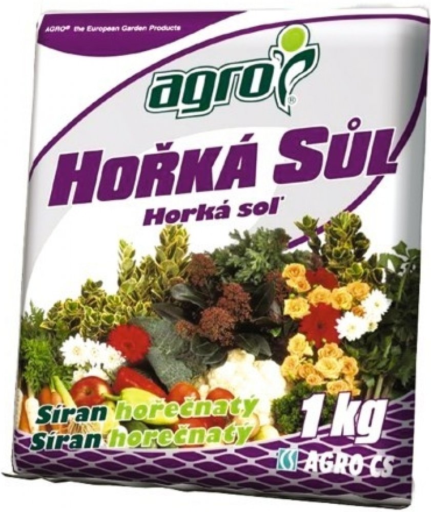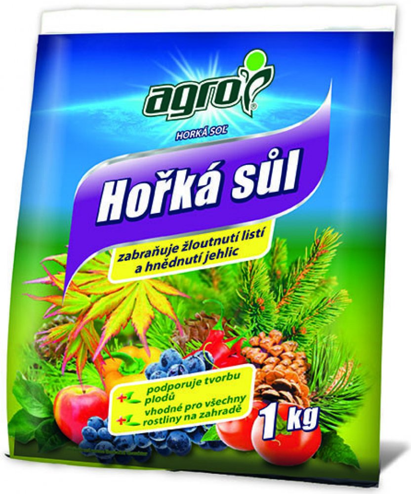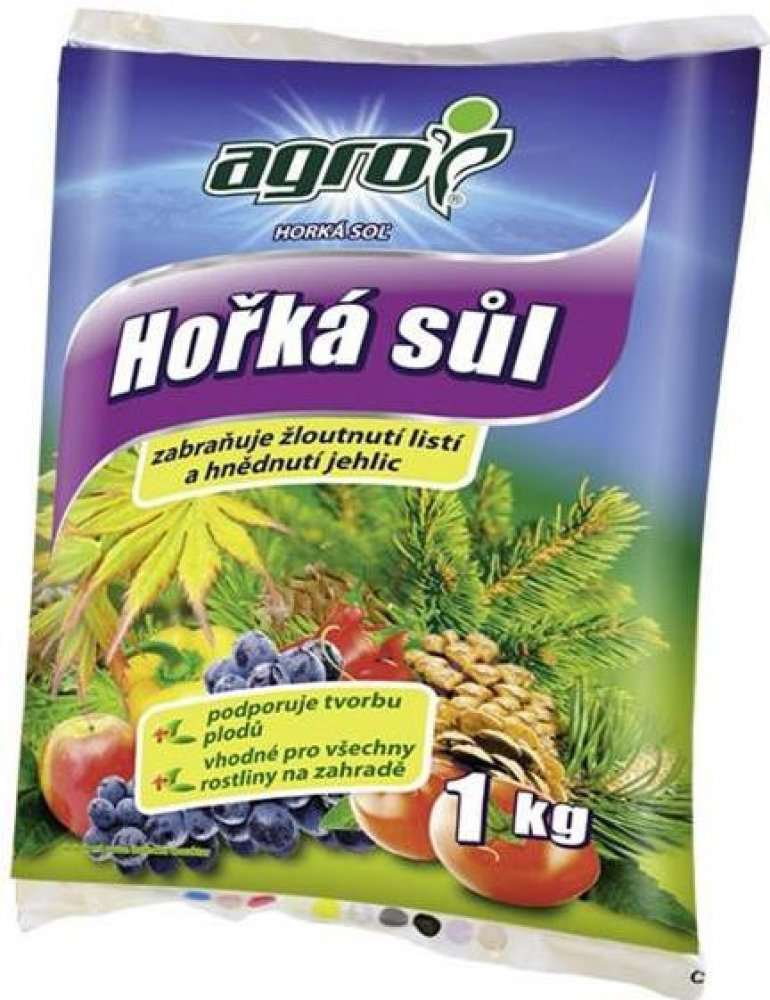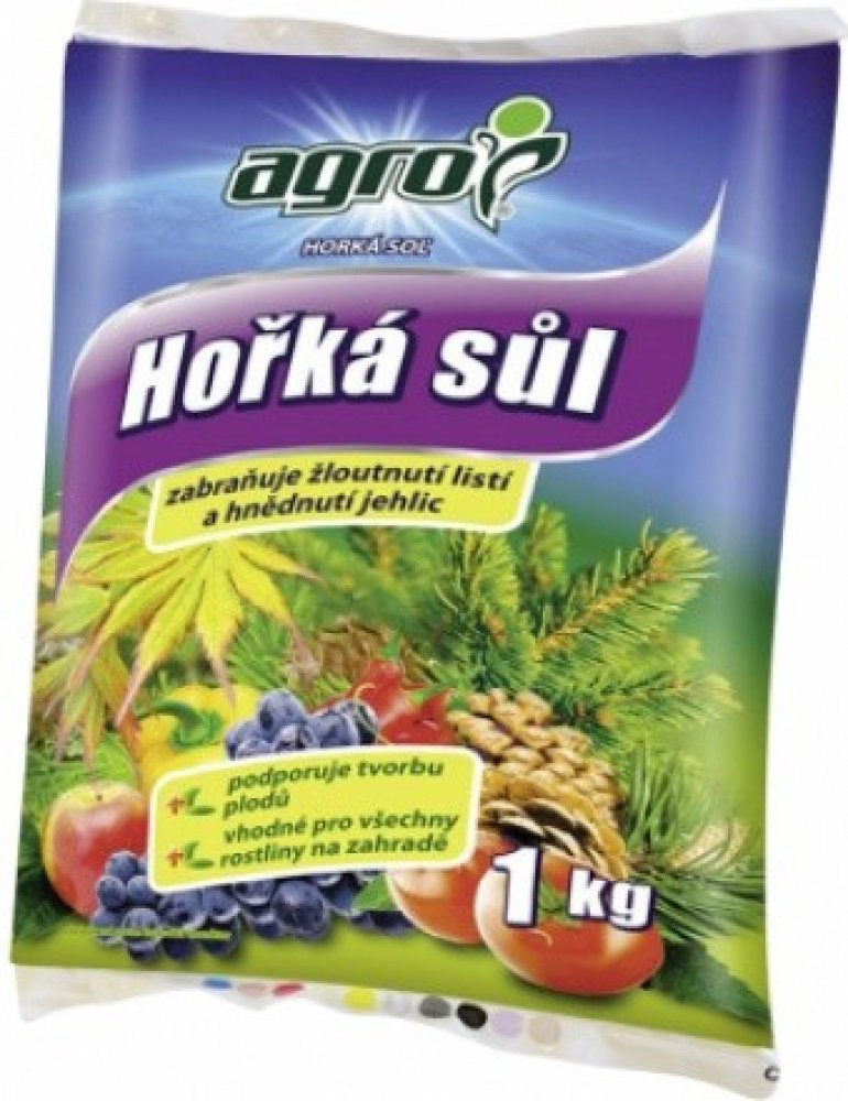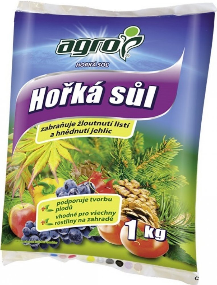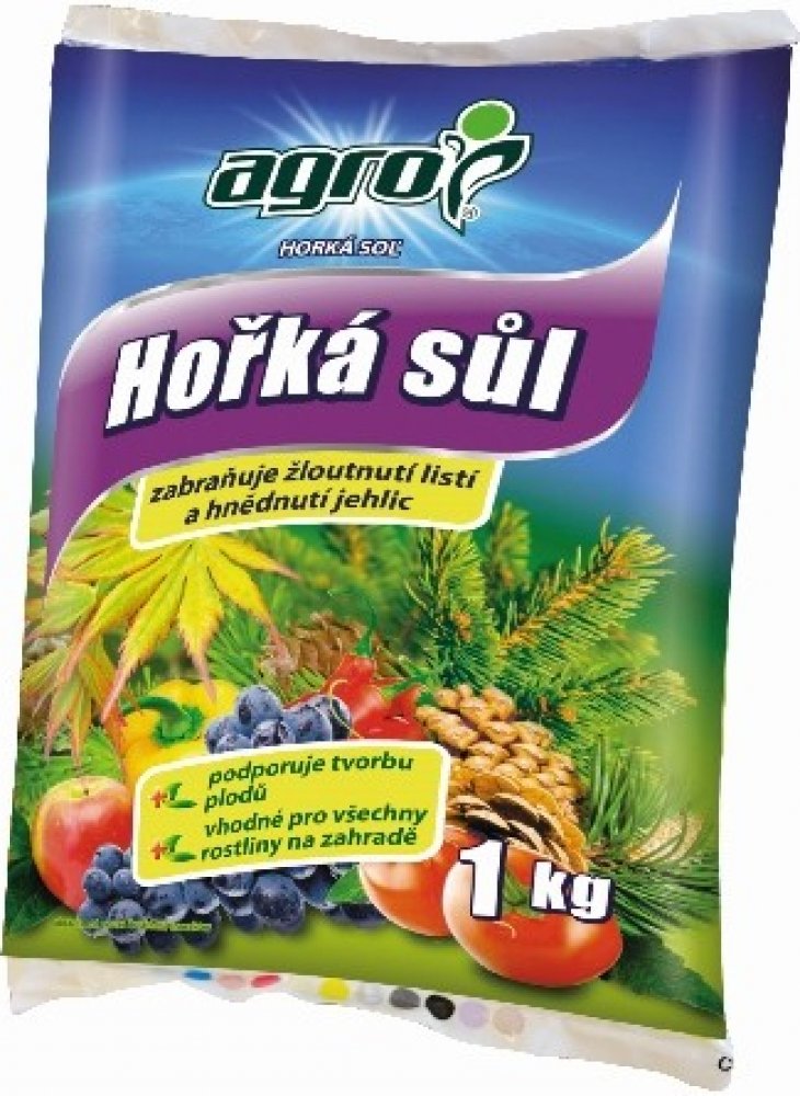 Agro Hořká sůl je krystalické hořečnaté hnojivo určené pro rychlé odstranění skrytého i zjevného nedostatku hořčíku. Nedostatek hořčíku se projevuje hnědnutím a zvýšeným opadáváním jehličí nebo žloutnutím listů, čemuž zabráníme správným užíváním tohoto hnojiva. Vysoký obsah hořčíku v tomto hnojivu zvyšuje tvorbu chlorofylu (zeleného barviva) a je pro rostliny okamžitě přijatelný.