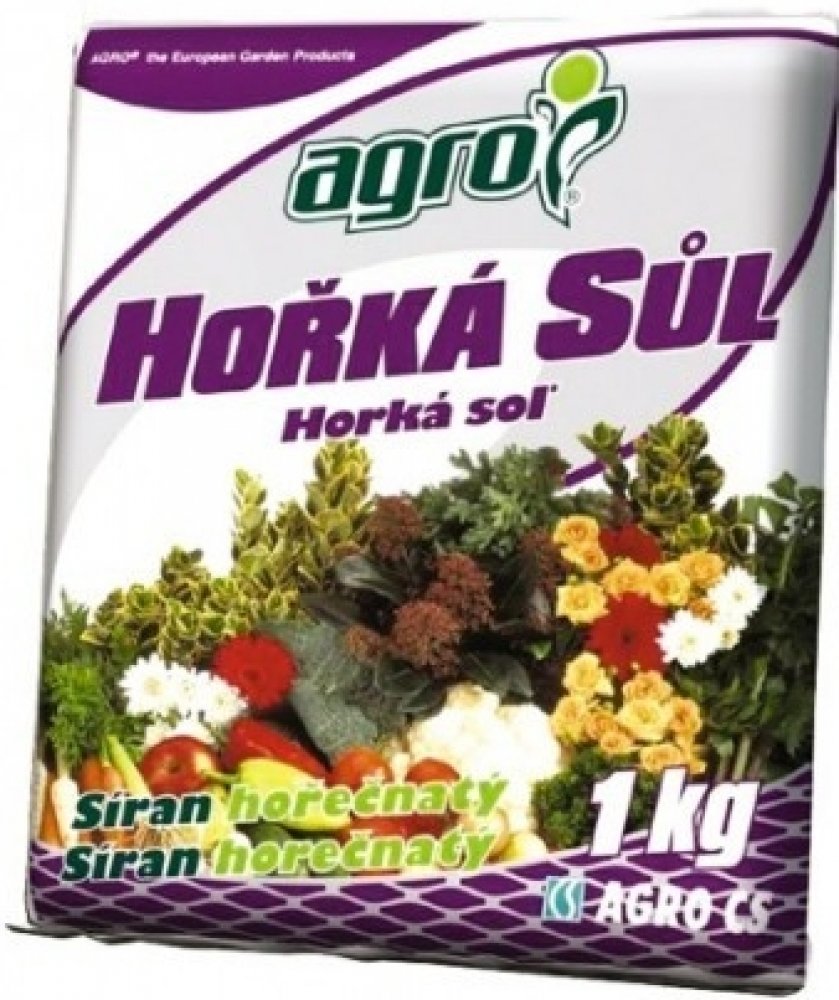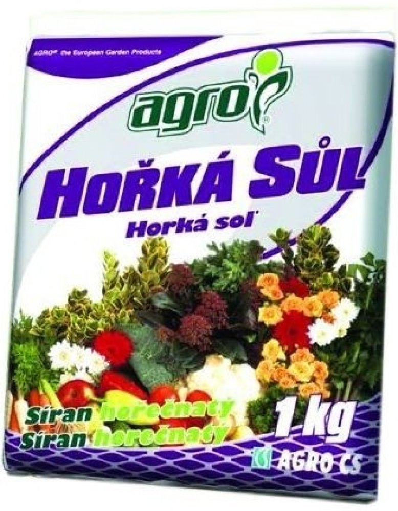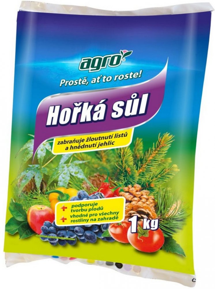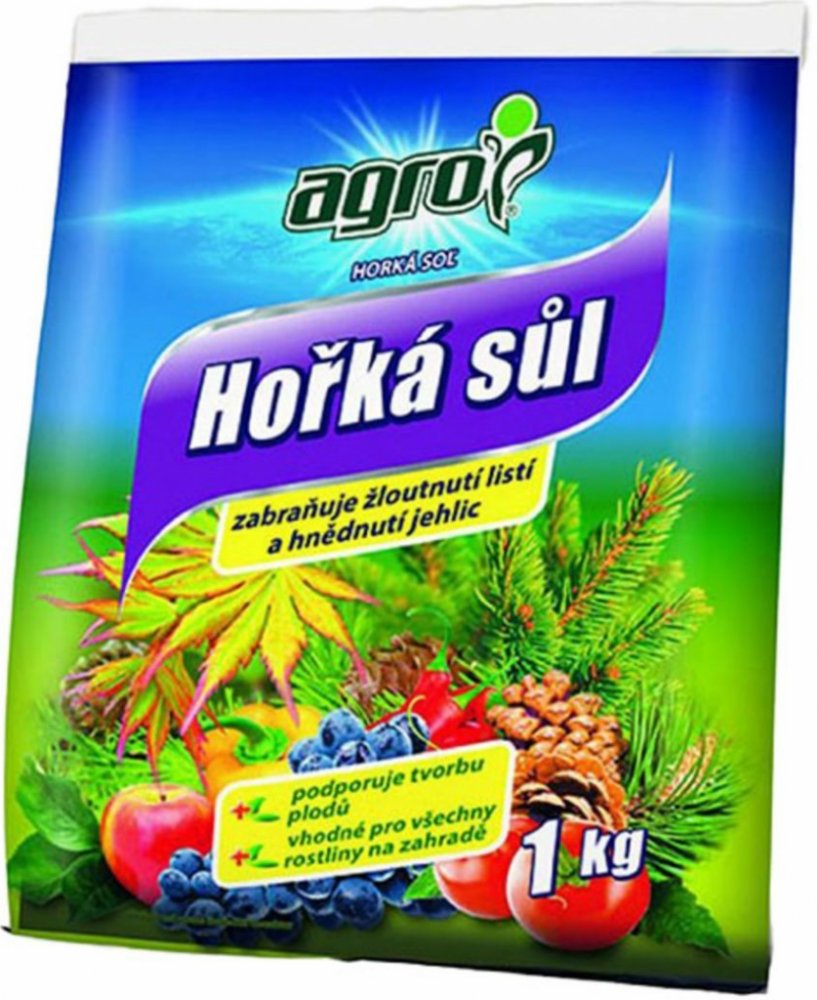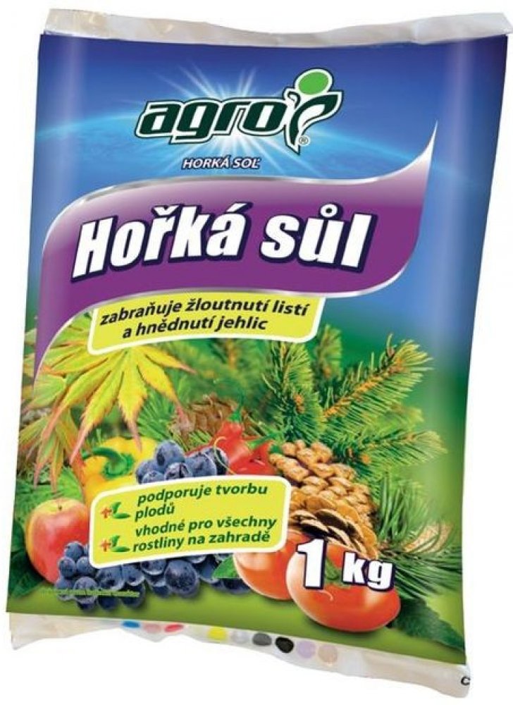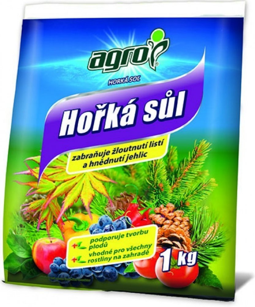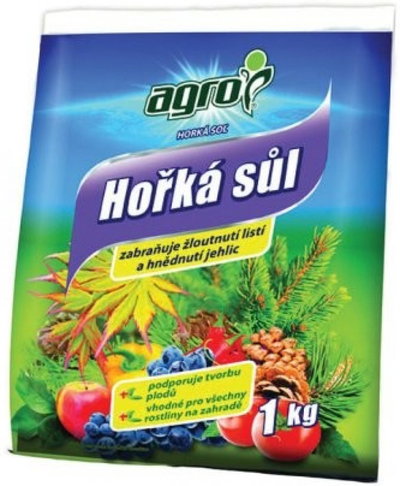 Agro Hořká sůl je krystalické hořečnaté hnojivo určené pro rychlé odstranění skrytého i zjevného nedostatku hořčíku. Nedostatek hořčíku se projevuje hnědnutím a zvýšeným opadáváním jehličí nebo žloutnutím listů, čemuž zabráníme správným užíváním tohoto hnojiva. Vysoký obsah hořčíku v tomto hnojivu zvyšuje tvorbu chlorofylu (zeleného barviva) a je pro rostliny okamžitě přijatelný.