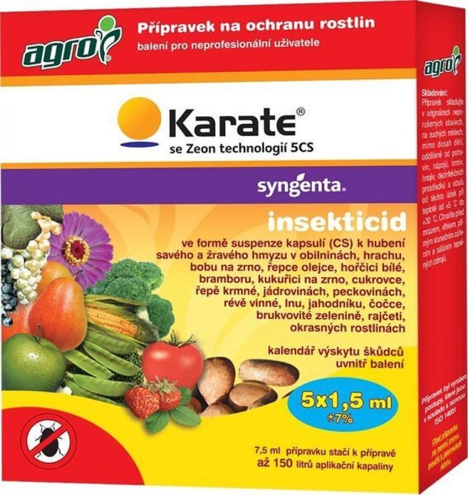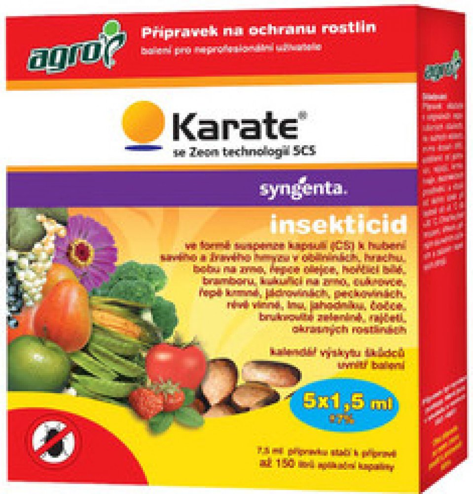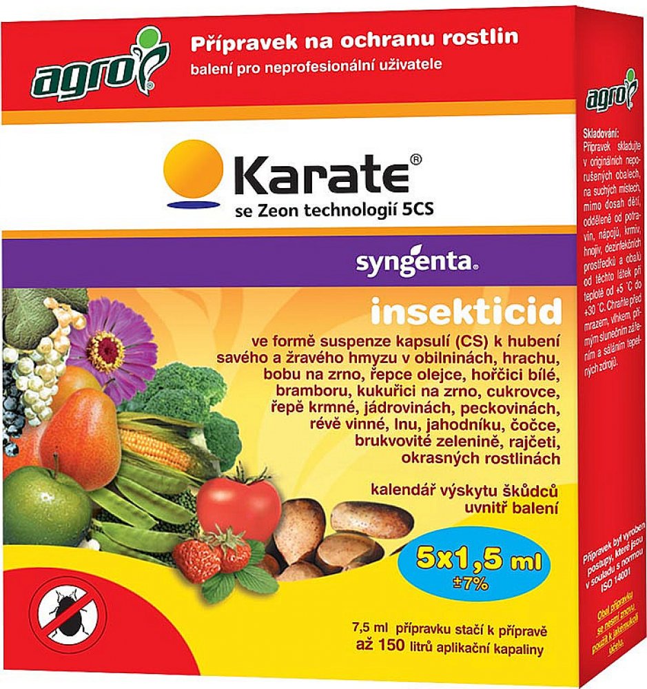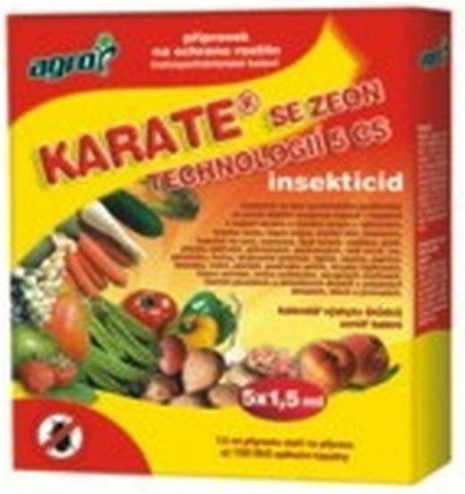 AGRO Karate se Zeon technologií 5 CS je účinný insekticid, který rychle hubí široké spektrum savého a žravého hmyzu . Působí jako dotykový a požerový jed s repelentním účinkem. Má velice široké spektrum účinnosti ( mandelinka na bramborách a rajčatech; květopas na jahodách a jabloních; mšice na hrachu, paprikách; molice na okurkách a rajčatech; bělásek na brukvovité zelenině; obaleč na jabloních...