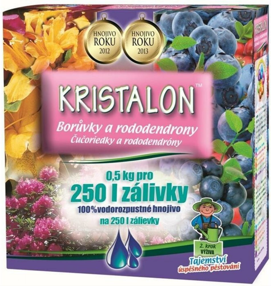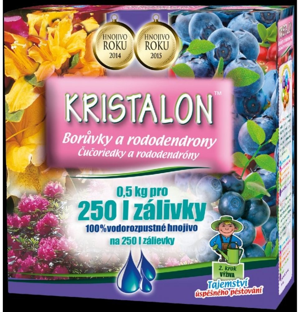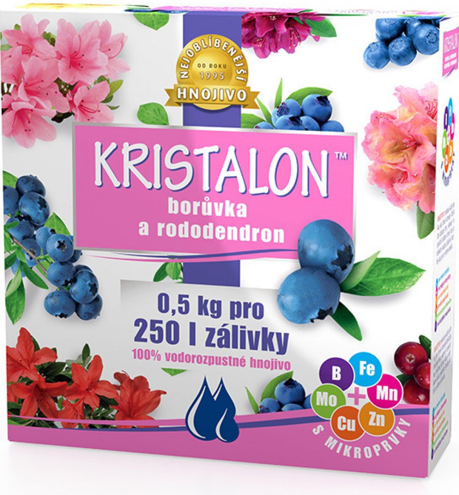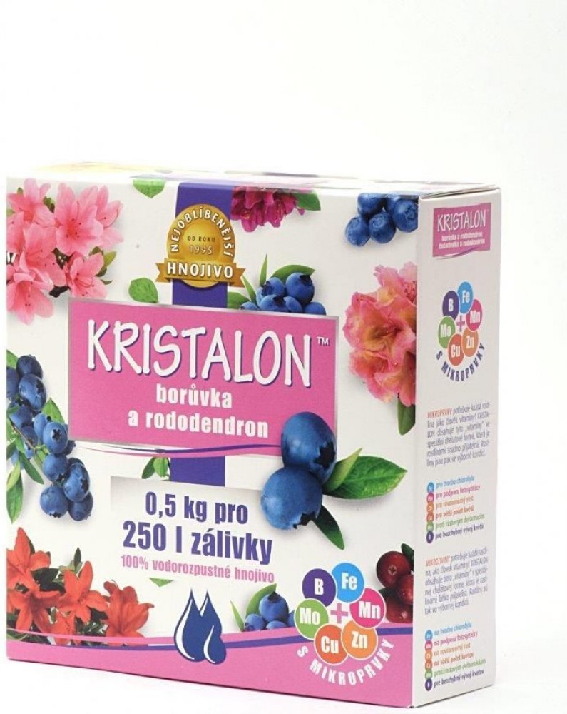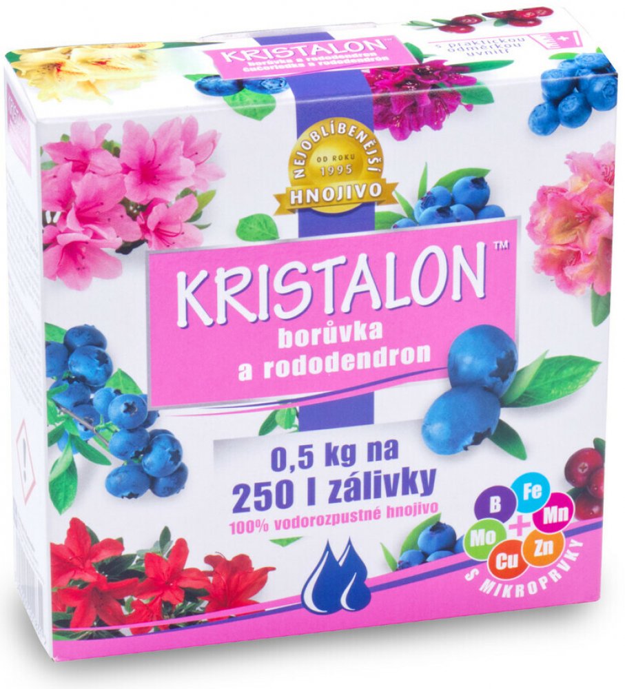 KRISTALON Borůvky a rododendron je krystalické vodorozpustné hnojivo určené na rododendrony, azalky, borůvky, vřesy nebo vřesovce a jiné kyselomilné rostliny. Vhodné pro Rhododendron, Azalea, Ericaceae.