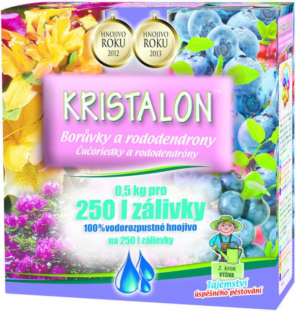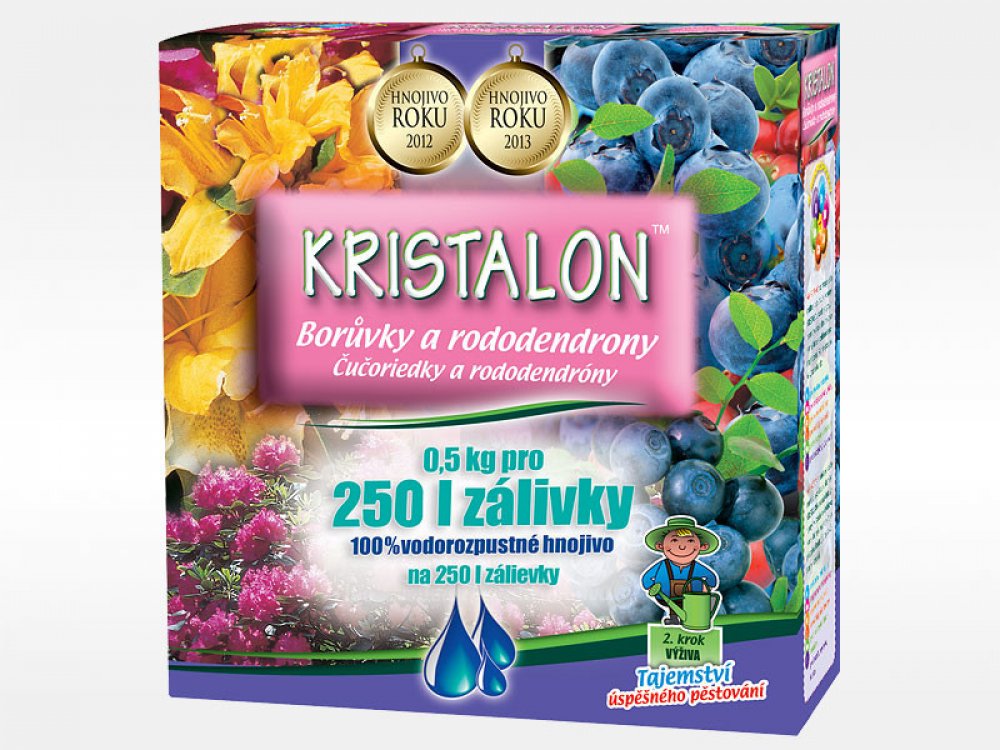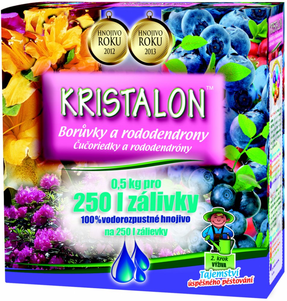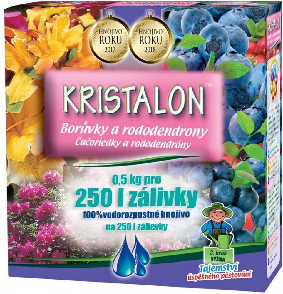 KRISTALON Borůvky a rododendron je krystalické vodorozpustné hnojivo určené na rododendrony, azalky, borůvky, vřesy nebo vřesovce a jiné kyselomilné rostliny. Vhodné pro Rhododendron, Azalea, Ericaceae.