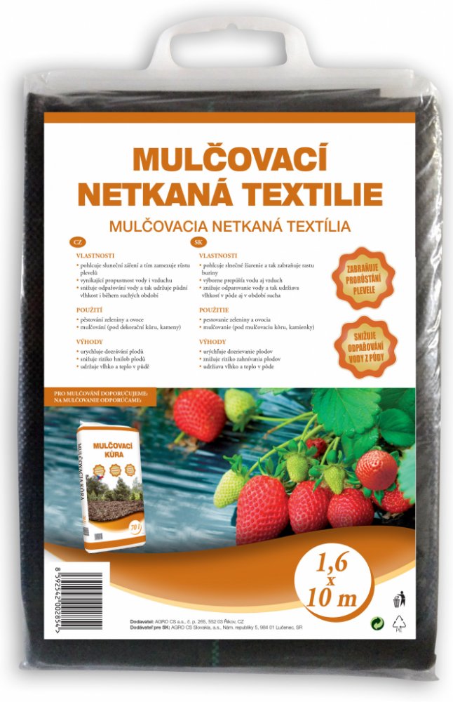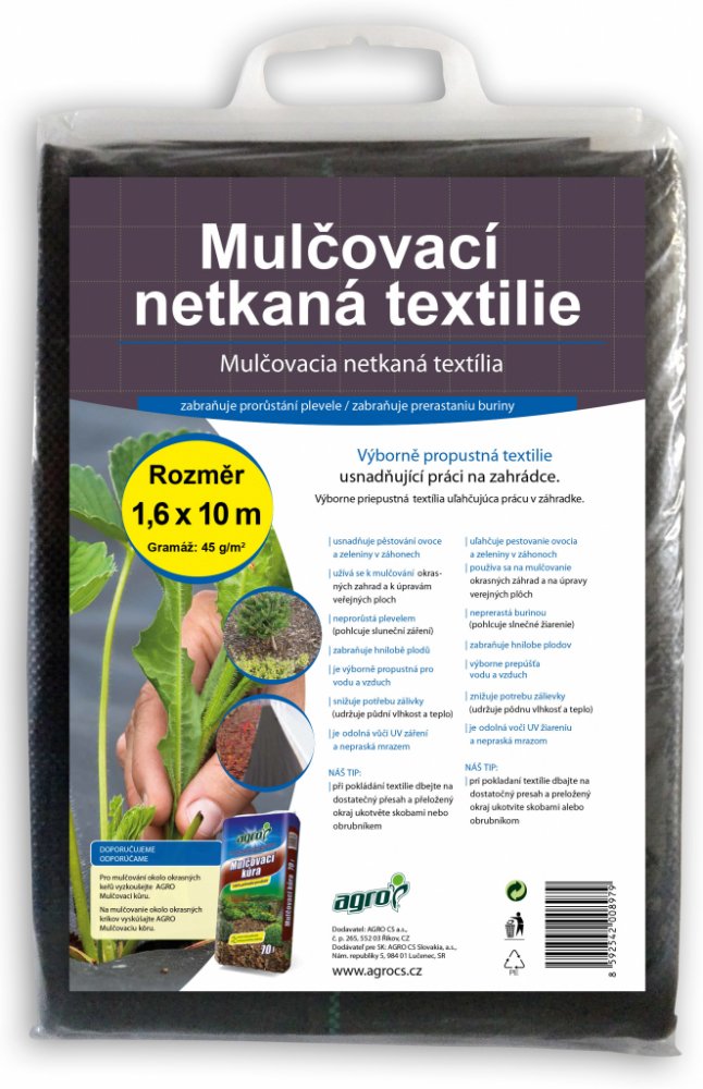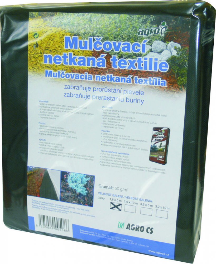 AGRO Mulčovací netkaná textilie je porézní tkanina, která svým určením zabraňuje prorůstání plevele, výborně propouští vodu i vzduch, snižuje odpar vody, je odolná vůči UV záření, nepraská mrazem, snižuje nutnost používání herbicidů a výrazně zkracuje čas potřebný na údržbu záhonů. Je určena pro pěstování zeleniny a ovoce nebo pod mulčovací a dekorační materiály nebo kameny.