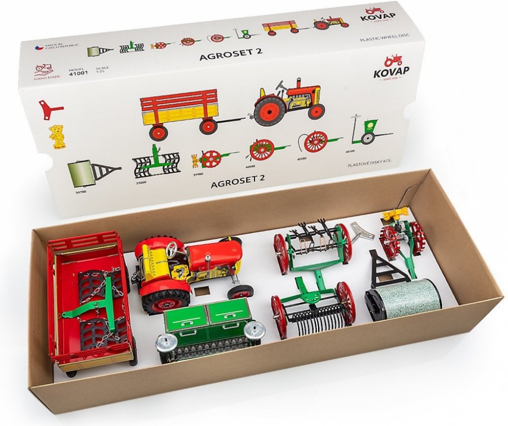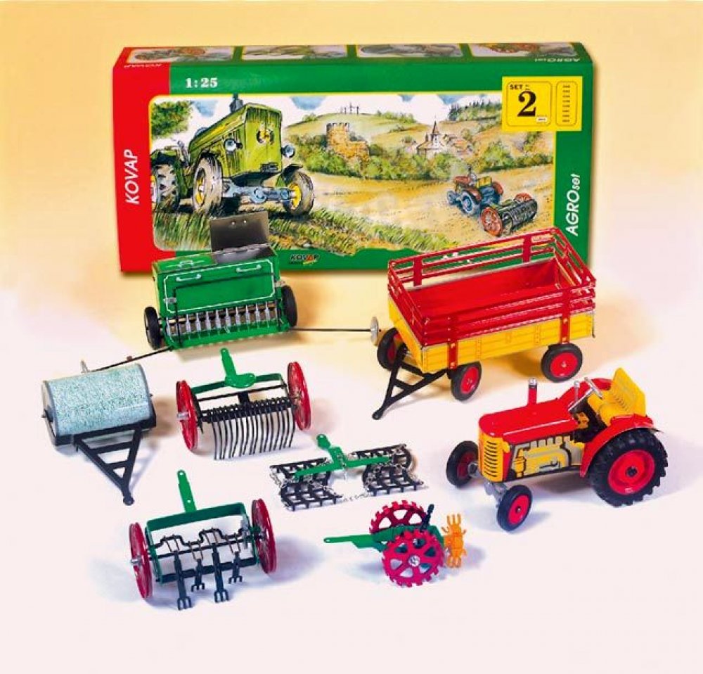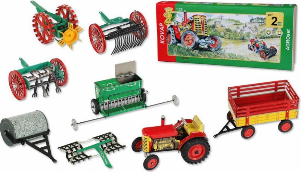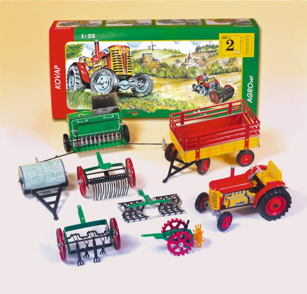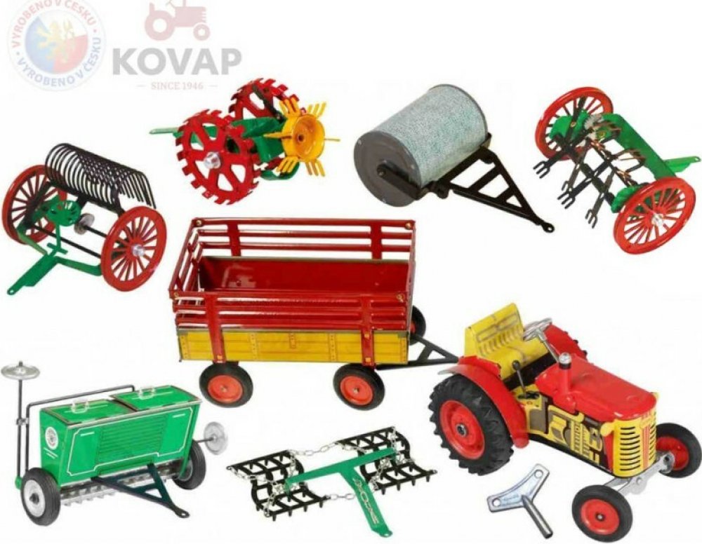 Odolný krásně řemeslně zpracovaný plechový model traktoru Kovap s platovými koly a pohonem, který zajišťuje mechanický pérový strojek natahovaný klíčkem. Traktor má čtyřrychlostní převodovku. Disponuje třemi rozdílnými rychlostmi vpřed, zpátečkou a neutrálem. Je rovněž vybaven ruční brzdou. Traktor lze volantem skutečně řídit a navíc ho i zabrzdit ruční brzdou.