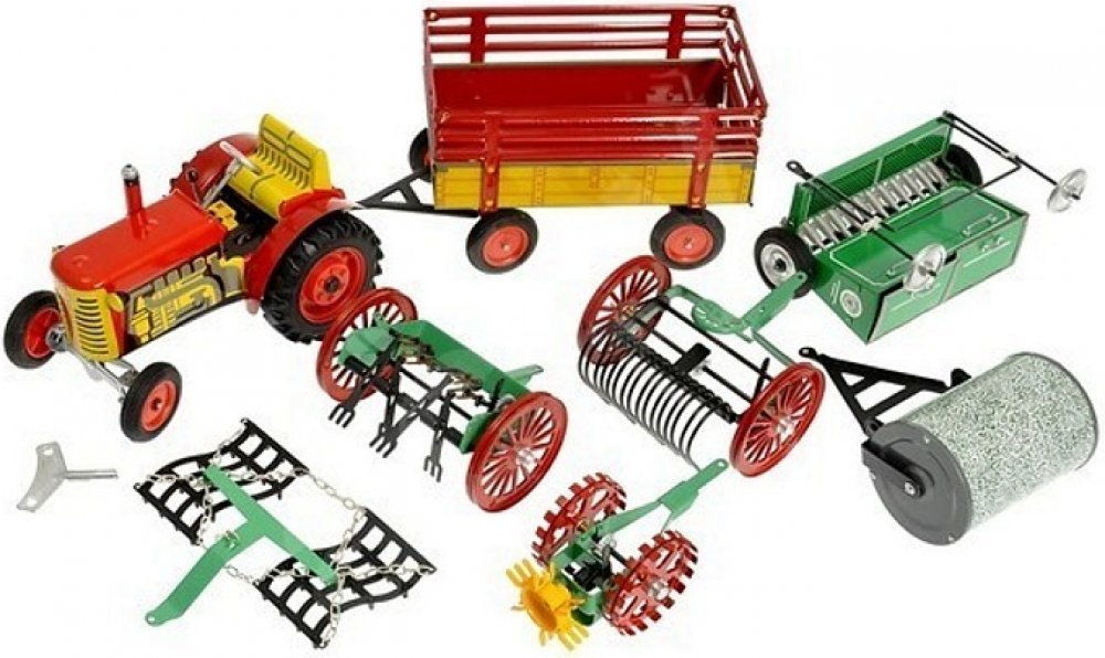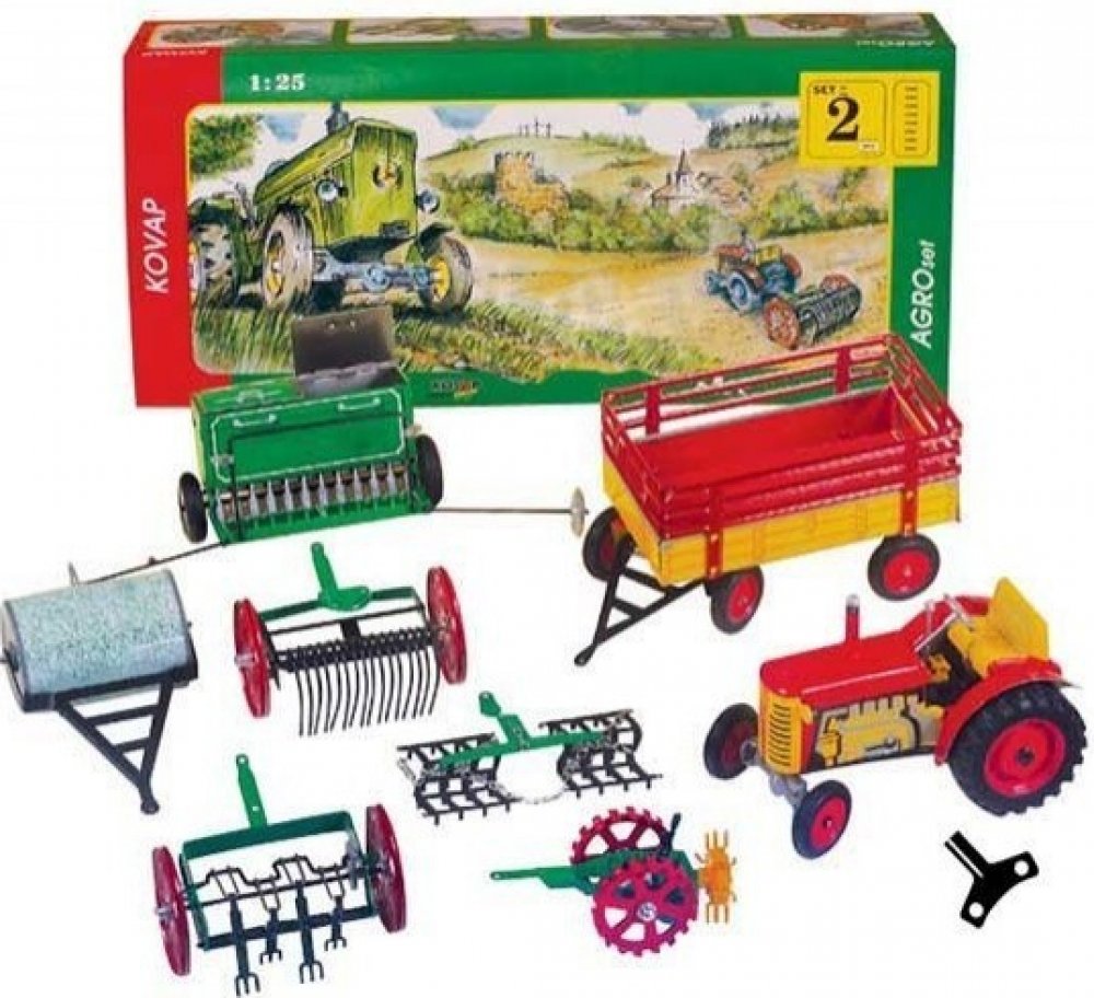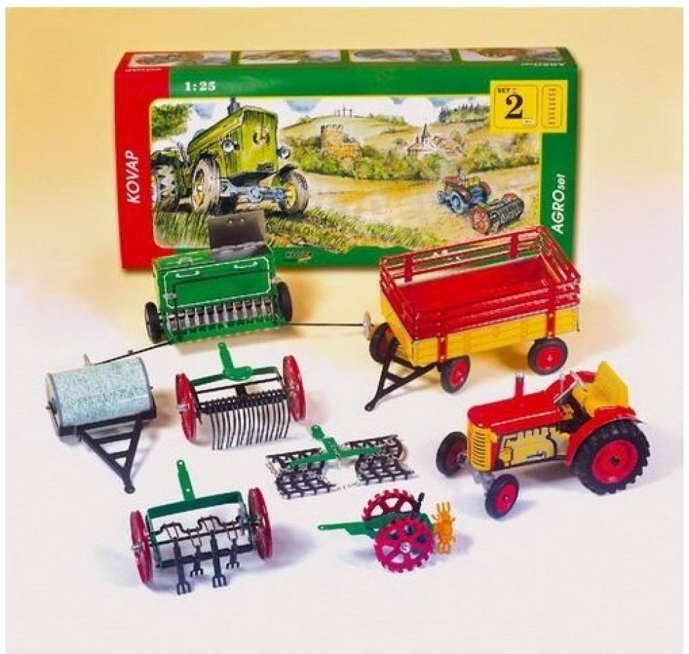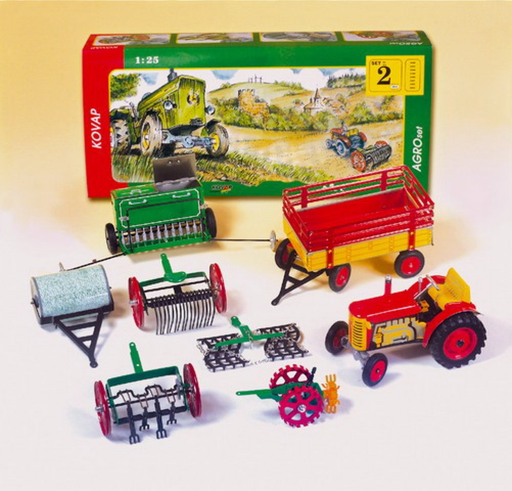Odolný krásně řemeslně zpracovaný plechový model traktoru Kovap s platovými koly a pohonem, který zajišťuje mechanický pérový strojek natahovaný klíčkem. Traktor má čtyřrychlostní převodovku. Disponuje třemi rozdílnými rychlostmi vpřed, zpátečkou a neutrálem. Je rovněž vybaven ruční brzdou. Traktor lze volantem skutečně řídit a navíc ho i zabrzdit ruční brzdou.