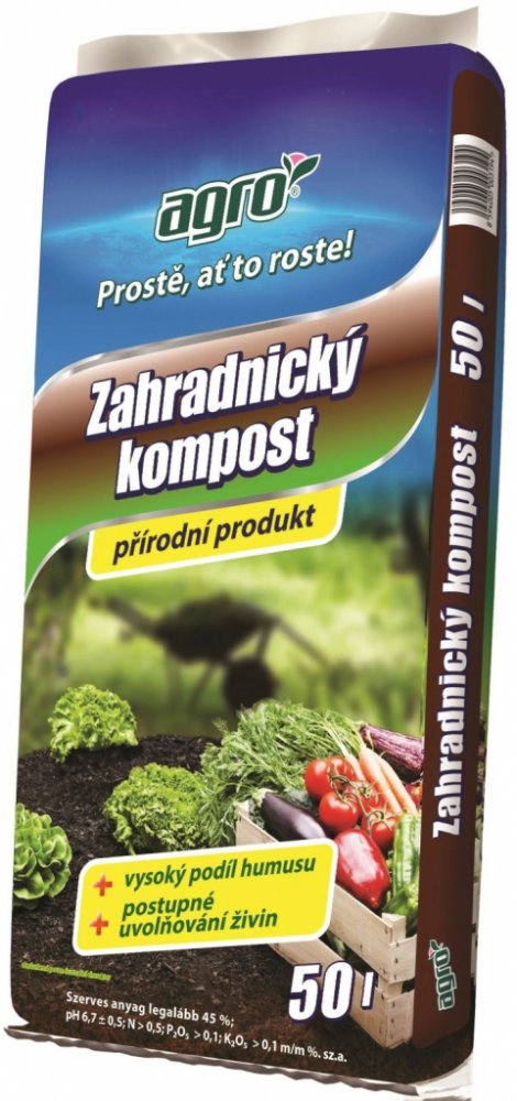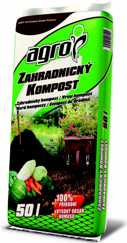 Zahradnický kompost s vysokým obsahem humusu Agro 50 l je organické hnojivo obsahující pouze přírodní látky, které vznikají zkompostováním surovin rostlinného původu. Kompost obsahuje přídavek dolomitického vápence.