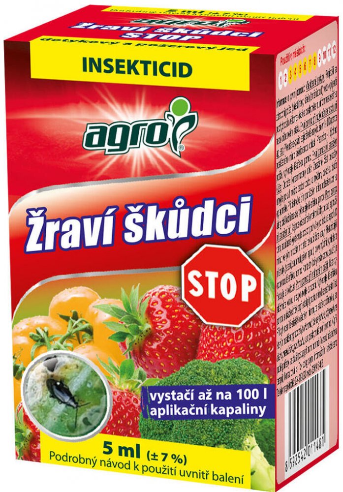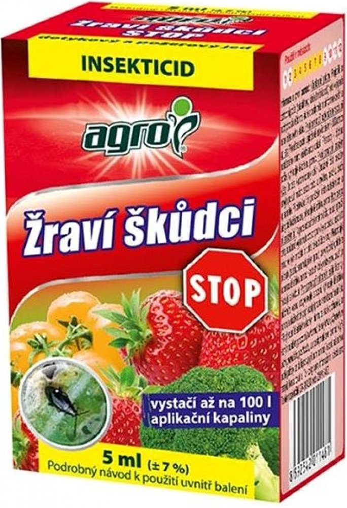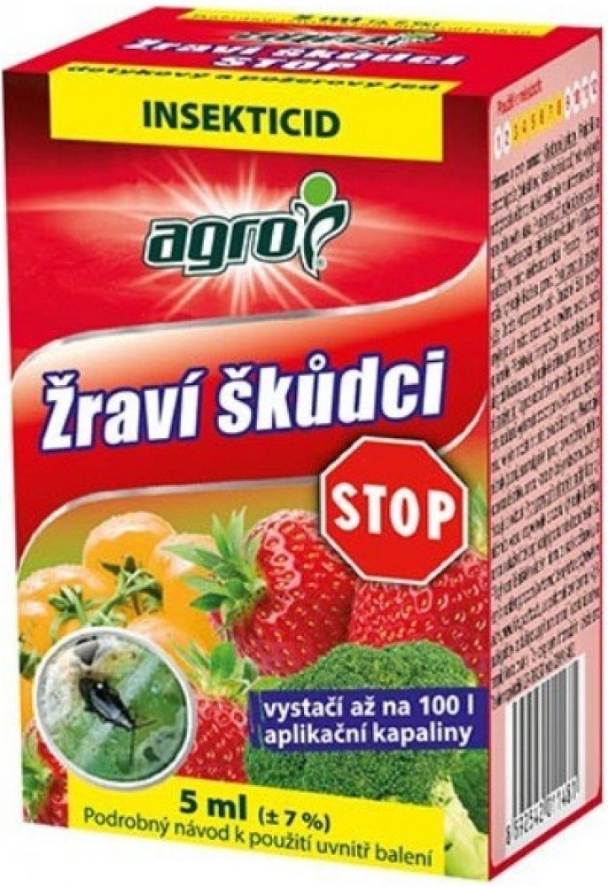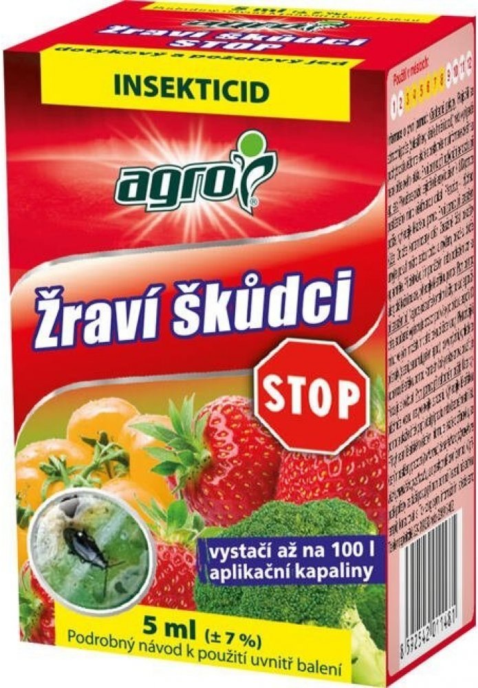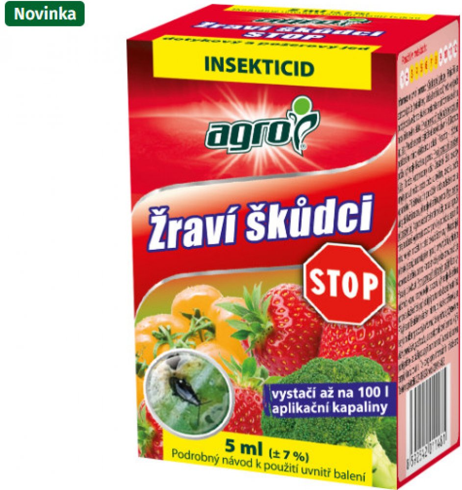 AGRO Žraví škůdci STOP je kontaktní insekticid – působí jako dotykový a požerový jed. Účinkuje proti květopasům, housenkám, třásněnkám apod. na zelenině, ovoci i okrasných rostlinách.