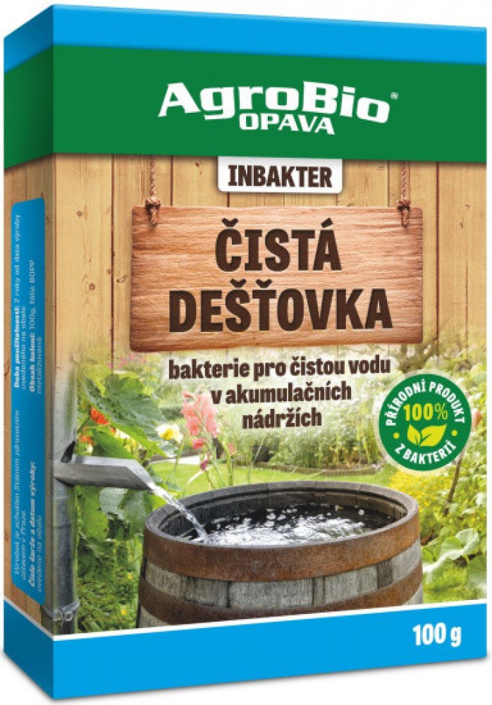 Bakterie pro čistou vodu v akumulačních nádržích BioRain je směsí nezávadných, nepatogenních užitečných bakterií a enzymů určených k ošetření dešťové vody v akumulačních (retenčních) nádobách. Bakterie obsažené v přípravku rozkládají organické nečistoty a tím udržují vodu v akumulační nádobě čistou, bez řas a bez zápachu. Voda ošetřená tímto přípravkem je bohatá na obsah přírodních bakterií, které následně při zalévání napomáhají k udržení půdní strukt ury, podporují výživu a dobrou kondici rostlin. Výhody používaní: Udržuje vodu v nádobě čistou Odstraňuje zápach Šetrné k životnímu prostředí Neškodí živočichům ani rostlinám Aplikace: Potřebné množství aktivujte ve 2 litrech vlažné vody ( cca 30-40°C ) a po 20-ti minutách aplikujte přímo do akumulační nádoby. 100g přípravku je měsíční dávkou pro akumulační nádobu o objemu 8 m3. Při přípravě roztoku nepoužívejte kovové nádoby a předměty! Uvedené informace mají informativní charakter. Před použitím si vždy přečtěte označení a informace o přípravku.