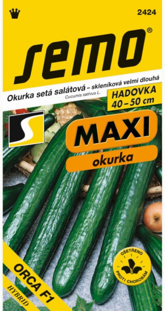 Maxi poloraná salátová okurka ORCA F1, dlouhé plody, hadovka, vhodná pro skleníky, foliovníky. kolekce MAXI salátová okurka 'hadovka' poloraná dlouhá partenokarpická salátová okurka typu „MULTIFRUIT“ se 100 % samičích květů plody jsou 40–50 cm dlouhé, tmavě zelené geneticky nehořké Okurka je plodinou první tratě. Vyžaduje záhřevné, hlinité, humózní půdy. Vzhledem k slabšímu kořenovému systému je náročná na dostatek přístupných živin a vyrovnaný vláhový režim. Vhodná předplodina je hrách, cibule, pór, fazol, řepa, košťáloviny, cukrovka a jetelotravní směsky. Nevhodné jsou brambory a jahody. Pozor na rezidua z herbicidů, zvláště triaziny a chlorsulfurony. Výsev provádíme od poloviny dubna do 10. května. V případě časných výsevů na pole je možné použití netkané textilie, kterou mohou být okurky přikryté až do doby začátku kvetení. Předpěstování rostlin je možné. Na předpěstování sadby počítejme 3–4 týdny před požadovaným termínem výsadby. Ve skleníku udržujeme stálou teplotu vzduchu a zajišťujeme větrání. Výsadbu na záhon provádíme v polovině května. Během vegetace udržujeme porost v čistém bezplevelném stavu plečkováním a okopávkou. V případě sucha zavlažujeme, raději větší dávky vody méně často. I přes výrazné polní rezistence je během vegetace důležitá chemická ochrana proti plísni okurkové. Choroba se projevuje světle zelenými až žlutými, žilnatinou ohraničenými skvrnami na plně vyvinutých listech. Na spodní straně skvrn se vytváří za příznivých podmínek šedofialový až šedý povlak sporangií. Počet skvrn narůstá, spojují se a zasychají, dochází k rozpadu pletiv mezi hlavními nervy. Silně postižené listy usychají a rostliny hynou. Choroba se šíří za deštivého počasí, je podporována ranními rosami. Z hlediska komplexní ochrany mají význam všechna opatření, která zabraňují ovlhčení nebo zkracují dobu ovlhčení listu (větrání, racionální závlaha, vertikální vedení) a využívají tolerantních odrůd, spolu s rozumnou chemickou ochranou. V souladu se seznamem registrovaných prostředků na ochranu rostlin doporučujeme používat k ošetřování proti plísni okurkové přípravky v intervalech 10–14 dní, při silném infekčním tlaku 7–10 dní. Více informací o ochraně okurek proti plísni najdete v článku ZDE. Doporučený řez dlouhoplodých hadovek - sklizeň plodů nad 25 cm: 1) do 3.–4. nodu odstranit boční letorosty, 2) do 4.–5. nodu zaštipovat boční letorosty už za 1. listem , 3) odstraňovat odplozené boční letorosty. Uvedený způsob řezu je možno využít také u všech hadovek typu „MULTIFRUIT“ s plodem delším než 20 cm. Uvedené informace mají informativní charakter. Před použitím si vždy přečtěte údaje na obalu a připojené informace o produktu.