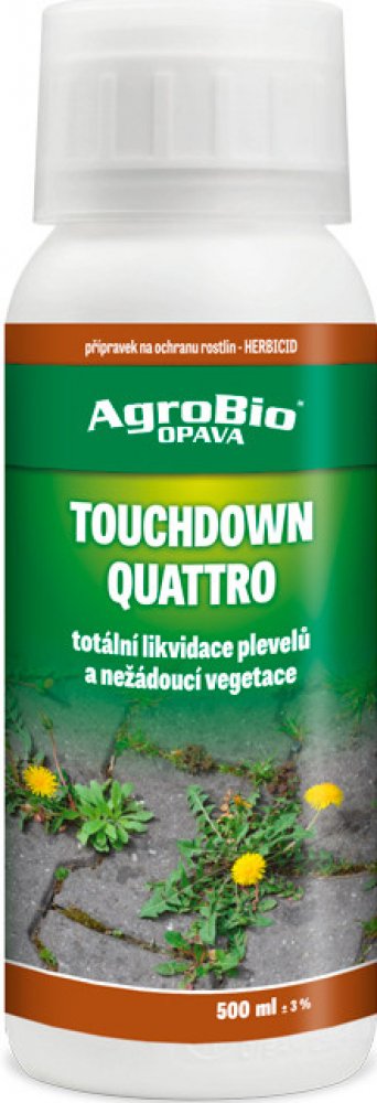 AGRO Touchdown Quatro je systémový (rozváděný po celé rostlině) listový totální herbicid, určený k hubení jednoletých a víceletých plevelů včetně pýru, pcháče osetu, apod. Jeho použití je vhodné na orné půdě před výsadbou, kompostech, cestičkách mezi záhony, ve vinicích, ovocných sadech (mimo broskvoně) a na nezemědělské půdě proti nežádoucím dřevinám (nátěr nebo nástřik do záseků na kmínku).
