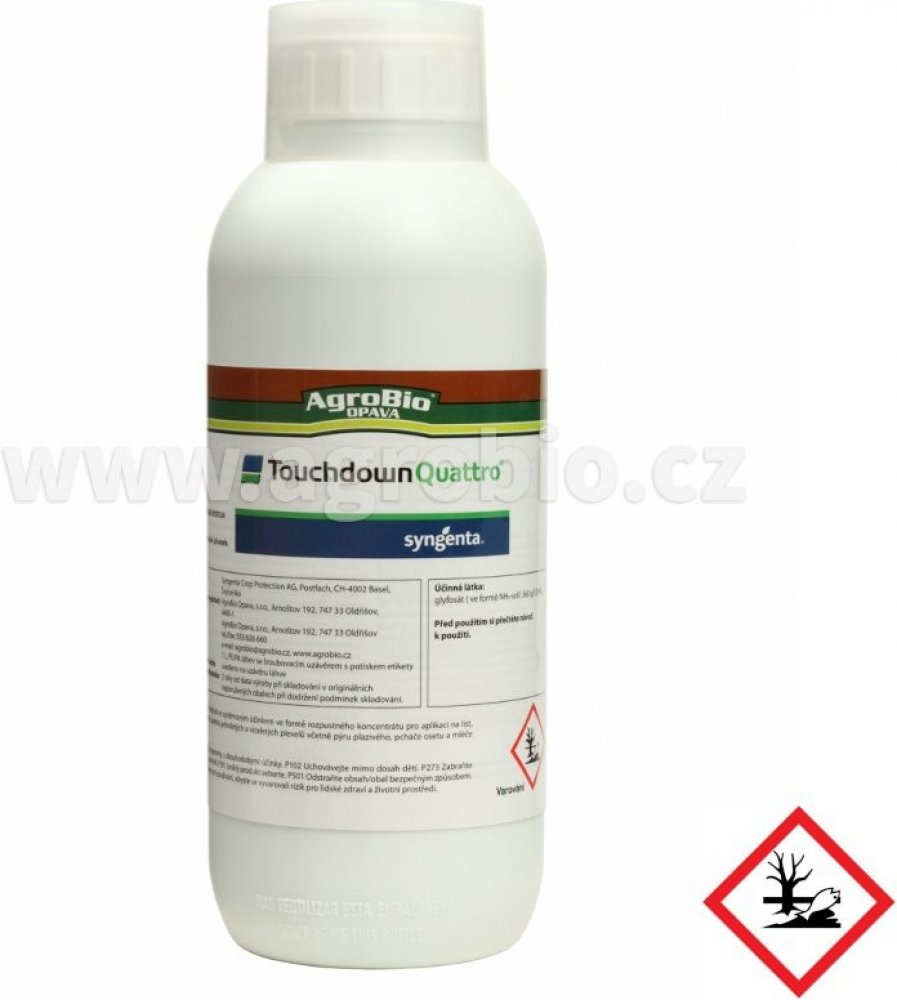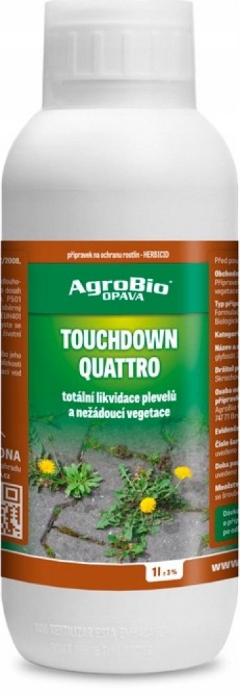 Totální herbicid pro hubení plevelů a nežádoucí vegetace.Vlastnosti:- Účinná látka: glyfosát 360 g/lJak účinkuje?TOUCHDOWN QUATTRO obsahuje účinnou látku glyfosát, která je přijímána listy. Přípravek působí neselektivně jako listový systemický herbicid proti širokému spektru jednoletých a víceletých plevelů včetně pýru plazivého, pcháče osetu a mléče rolního před setím nebo výsadbou, před sklizní nebo na strniště. V rostlinách se rychle šíří. Po aplikaci na list aktivně rostoucích plevelů je TOUCHDOWN QUATTRO translokován do kořenů, stolonů, oddenků, což vede k totálnímu zničení rostliny. Proto je důležité, aby plevele dosáhly dostatečné plochy povrchu listů, zajišťující vstřebání přípravku. Optimální doba pro aplikaci proti vytrvalým plevelům je těsně před nebo na začátku květu. K dosažení dostatečné translokace přípravku TOUCHDOWN QUATTRO do oddenků, je vždy třeba počítat s kultivací nejdříve týden po aplikaci. Uvětšiny vytrvalých plevelů je třeba počkat s kultivací minimálně 7 dní. Při kontaktu s půdou se inaktivuje.Pro jaké rostliny je registrován?- Cesty mezi záhony- Nezemědělská půda (chodníky, kolem plotů, antukové hřiště, aj.)- Půda (příprava před výsevem, výsadbou)- Réva vinná, ovocné sady (kromě broskvoní)Jak jej použít?- Postřikem na vzlešlé plevele (je přijímám zelenými částimi rostlin)- Přípravkem se v plné dávce ošetřuje jednou ročně- Přípravek nesmí zasáhnout okolní porosty!- Aplikujte pozemně postřikem- Nedostatečné vypláchnutí aplikačního zařízení může způsobit poškození následně ošetřovaných rostlin- Přípravek nesmí zasáhnout okolní porosty (pro které není tento přípravek registrován)