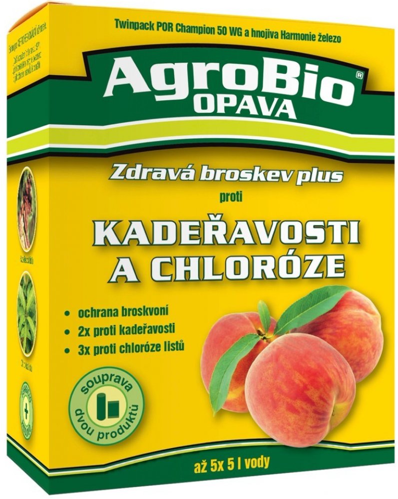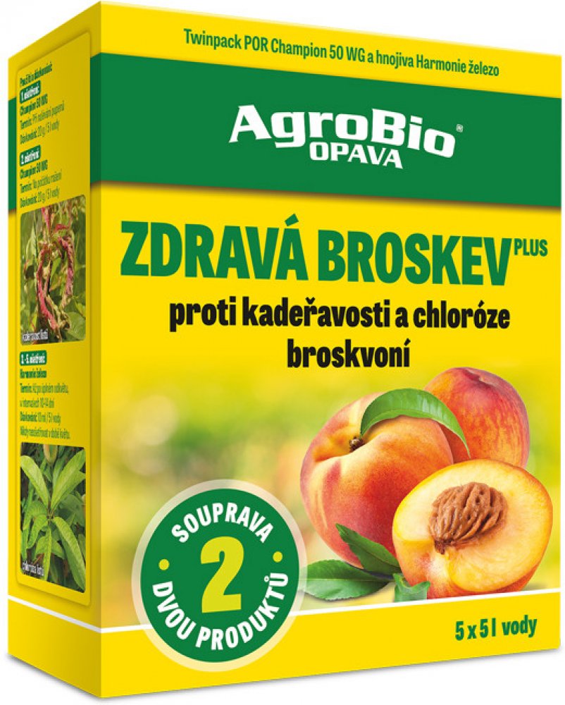 AgroBio Zdravá broskev plus je souprava 2 přípravků (Champion 50 WG a Harmonie Železo), které jsou určeny pro ošetření broskvoní proti kadeřavosti a chloróze listů. Champion 50 WG je fungicidní měďnatý přípravek, který je ve formě smáčitelného prášku k ochraně proti houbovým a bakteriálním chorobám rostlin. Harmonie Železo je kapalné (chelátové) listové hnojivo ve velmi snadno přístupné formě pro prevenci nebo vyřešení výživového problému - chloróza listů. Lidově řečeno žloutenka listů je způsobená špatným přijmem železa rostlinou. Aplikuje se výhradně postřikem na list. Přípravek je určen pro broskvoně k odstranění kadeřavosti a chlorózy listů. Aplikace přípravku: 1. ošetření - ve fázi nalévání pupenů (Champion 50 WG: 20 g/ 5 L vody) 2. ošetření - ve fázi max. na počátku rašení (Champion 50 WG: 20 g/ 5 L vody) 3.- 5. ošetření - ve fázi po odkvětu (Harmonie Železo: 10 ml / 5 L vody)
