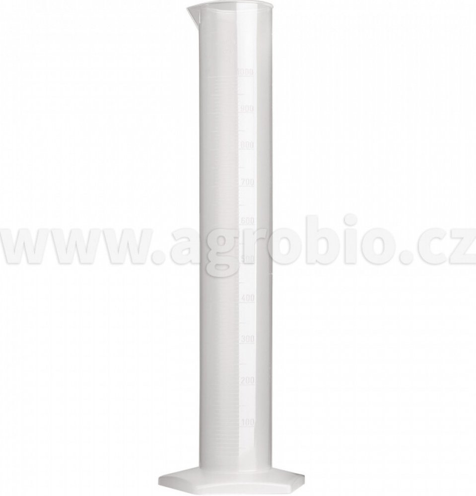 Vysoký odměrný válec vyrobený z polypropylenu s objemem 1000 ml, který je autoklávovatelný do 121°C.