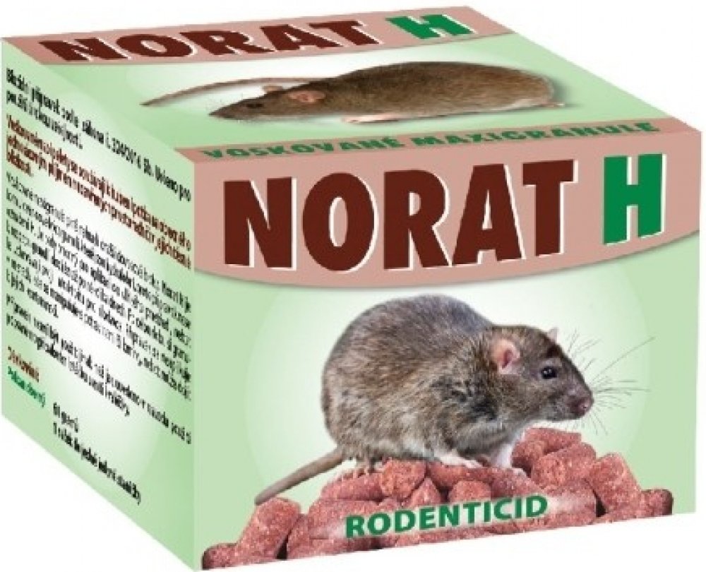 Hydrofobní požerová nástraha-granule na hubení myší a jiných hlodavců k aplikaci do jedových staniček, do vlhkého prostředí (kanalizace). Složení granulí zabraňuje jejich rozpadu ve vlhkém prostředí. Jed na myši Norat H udrží tvar po dobu několika dní. Vysoká účinnost již při malém množství. Obsahuje hořký averzivní prostředek.