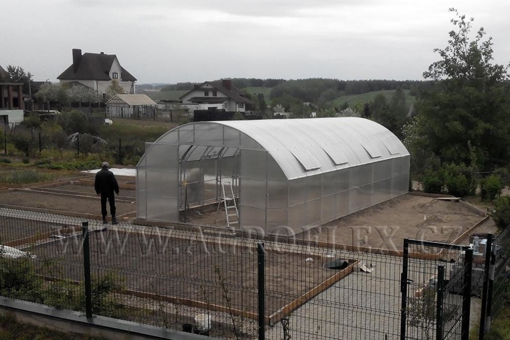 Farmářský profesionální velkokapacitní skleník z polykarbonátu s rovnými stěnami a s obloukovou střechou. Určen pro pěstování plodin, ale lze jej využít i jako sklad, garáž, výrobní halu, levné zastřešení bazénu a v dalších případech. Pokud je zahradní skleník vybaven vytápěním, bude možné pěstovat plodiny po celý rok. Pevné ručně vyrobený svařované oblouky. Odolné vůči velkému zatížení skleníku během zimního období při sněžení nebo větru. Na spojení jeklu jsou použité čtvercové spojky (spider). Rám skleníku se zatížením do 450 kg je vyroben z kvalitních pozinkovaných jeklu 40×20 a jsou z vnější a vnitřní strany pozinkováné. Jekl o tloušťce metalu 1 mm vydrží dlouhodobě i nepříznivé klimatické podmínky.