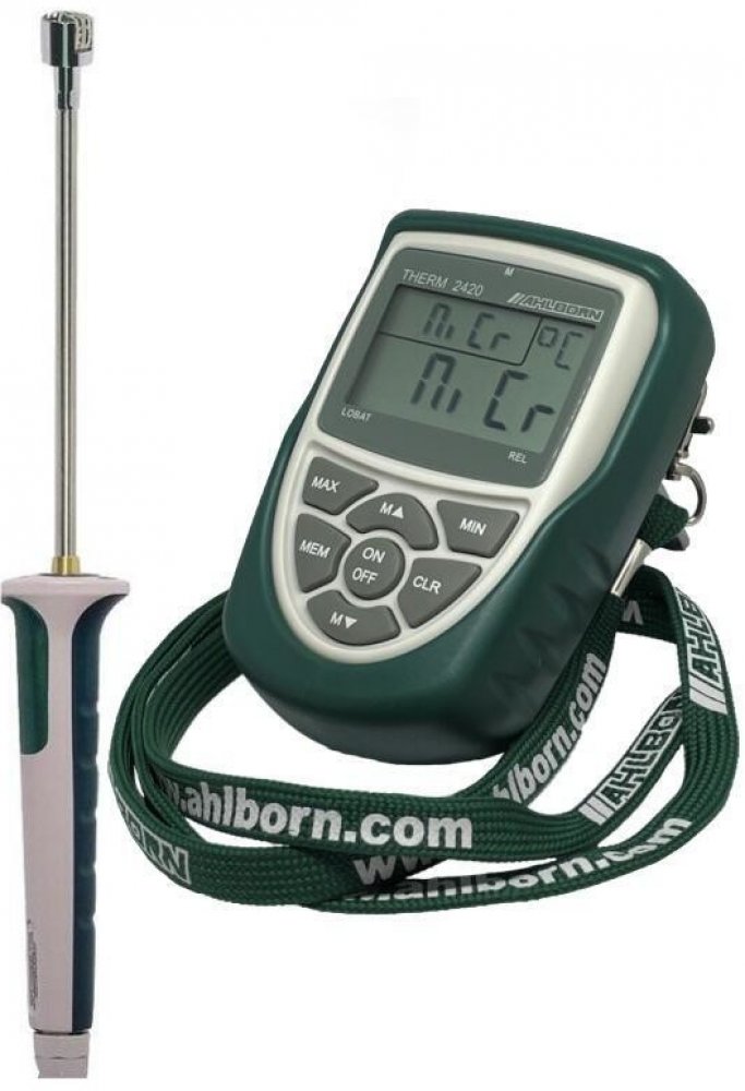 Set obsahuje digitální teploměr THERM 2420-1L a přímé dotykové teplotní čidlo FTF109PH (rozsah do 500°C, délka 180 mm) a ochranné pouzdro.
