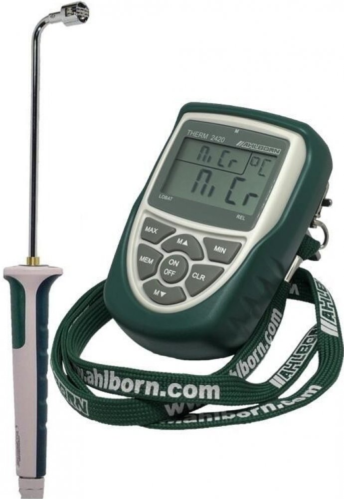 Set obsahuje digitální teploměr THERM 2420-1L a zahnuté dotykové teplotní čidlo FTF104PH (rozsah do 500°C, délka 180 mm) a ochranné pouzdro.