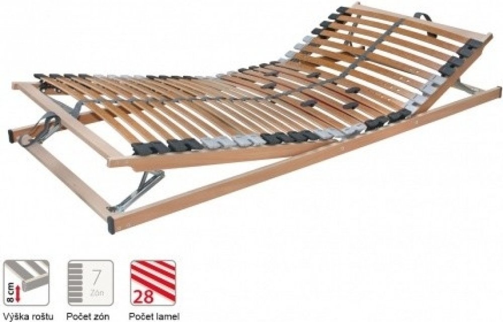 Pohodlný a odolný rošt s ručním polohováním vhodný pro odpočinek s pevnou středovou částí pro lepší oporu beder. Polohování roštu je vhodné i při zdravotních obtížích a únavě. Pružné lamely v 7 anatomických zónách jsou uložené ve dvojitých kaučuko vých pouzdrech. Změkčení v ramenou zajistí oporu páteře při spánku na boku. Středový popruh zlep...