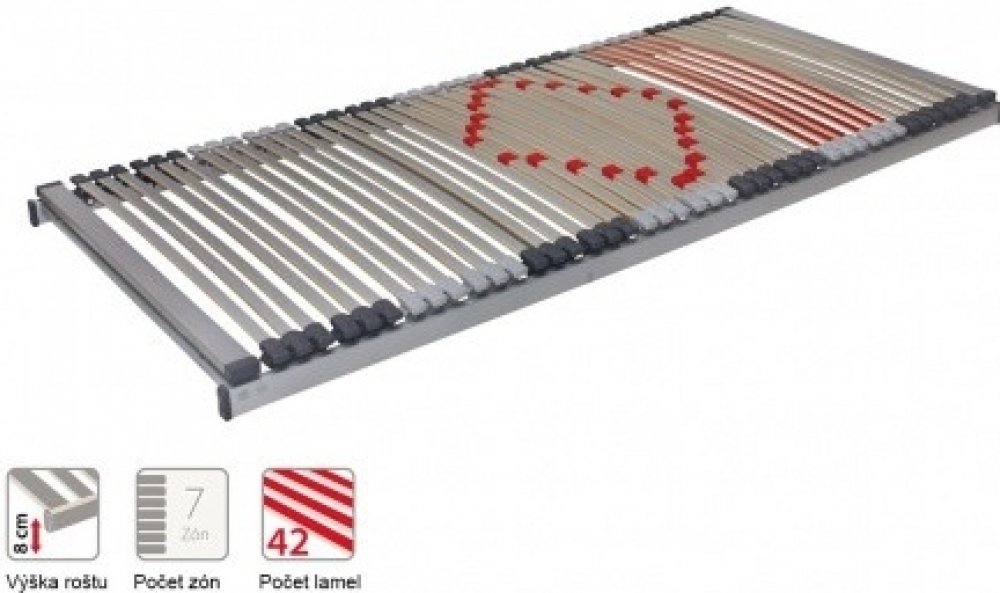 Skutečná velikost roštu je vždy o 1 cm užší a o 5 cm kratší než je uvedený standardní rozměr. Tím je zaručeno snadné a správné uložení roštu s matrací do rámu postele.