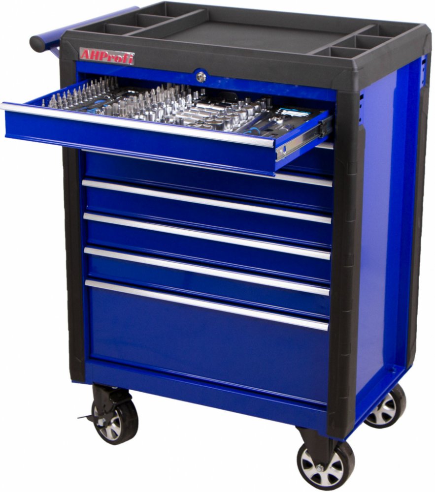 Pojízdný kovový dílenský vozík se 7 šuplíky vybavených 210 ks nářadí v pěnových výplních se bude hodit nejednomu profíkovi nebo kutilovi do jeho dílny.