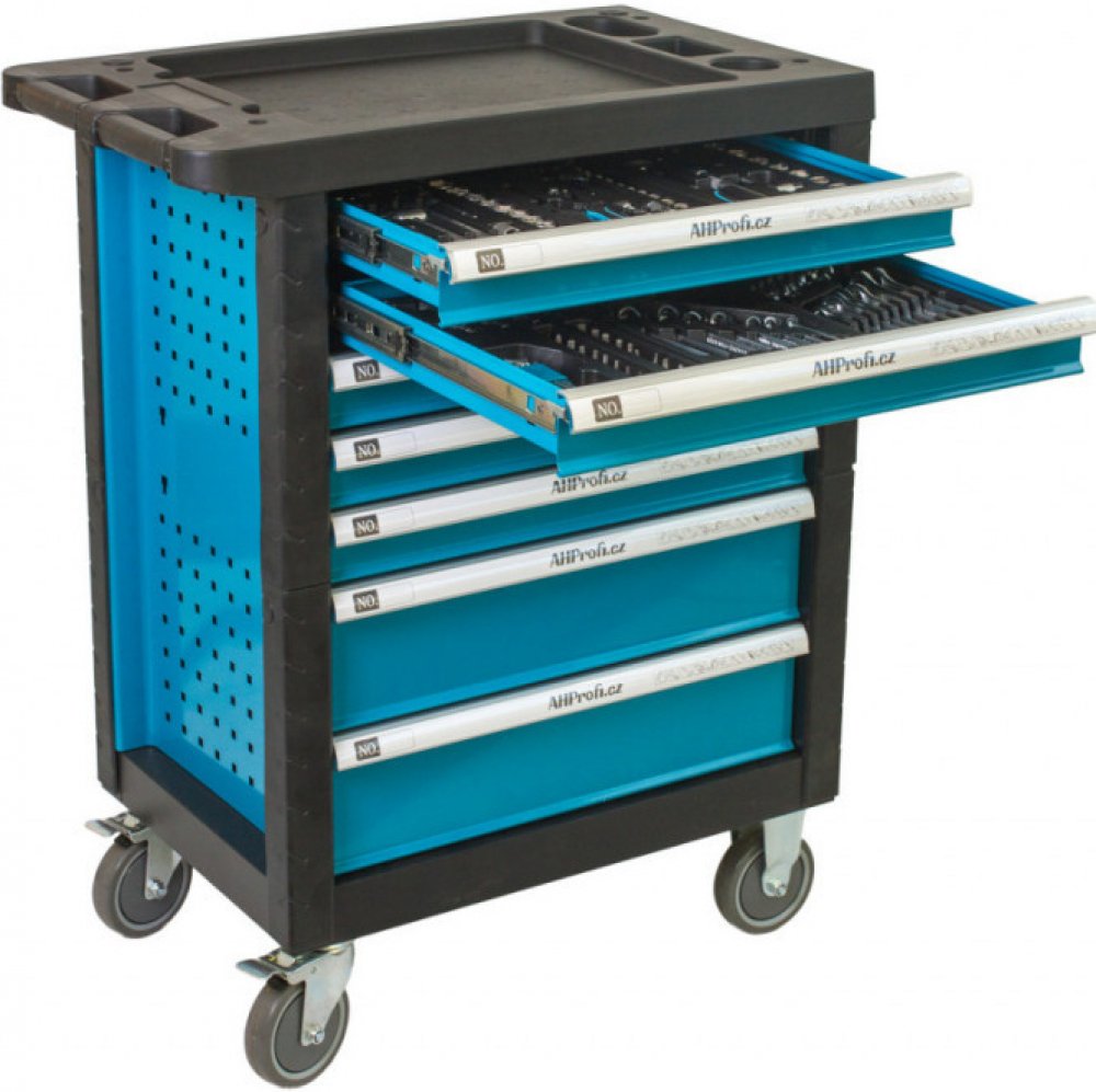 Modrý pojízdný kovový dílenský vozík se 7 šuplíky je vybavený nářadím nezbytným pro práci v dílně.