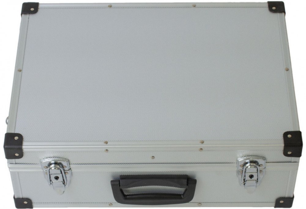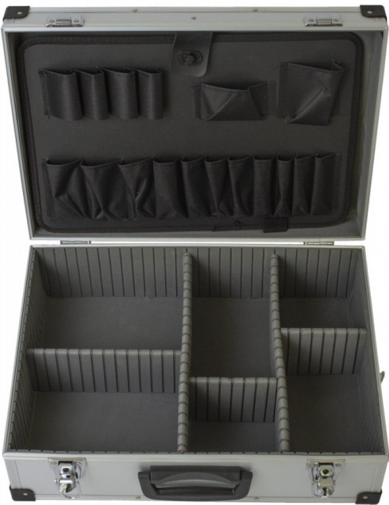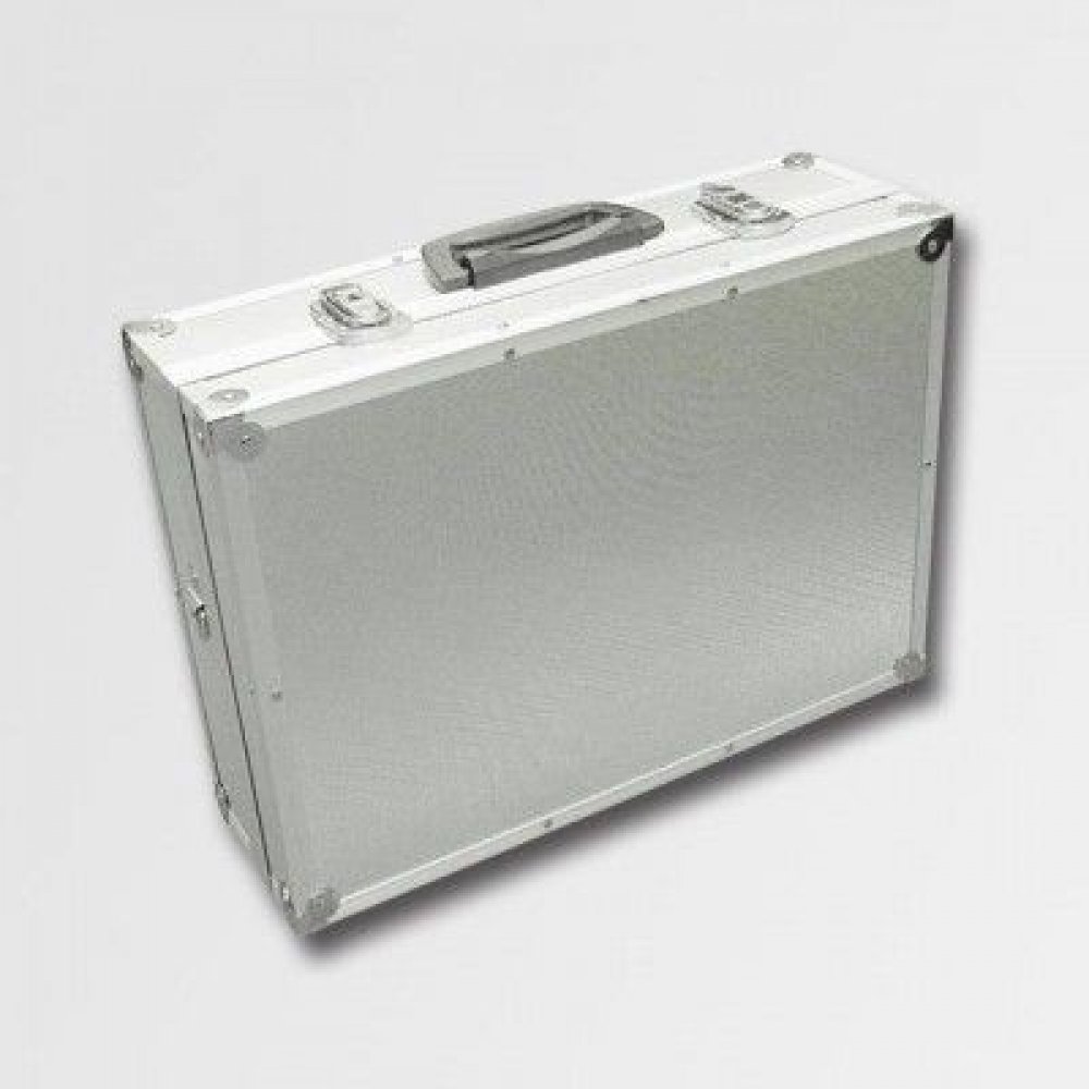 Hliníkový kufr na nářadí o rozměrech (š x h x v): 460 x 330 x 150 mm. Kufr je lehce přenosný díky madlu, nebo přídavnému popruhu na ramena.