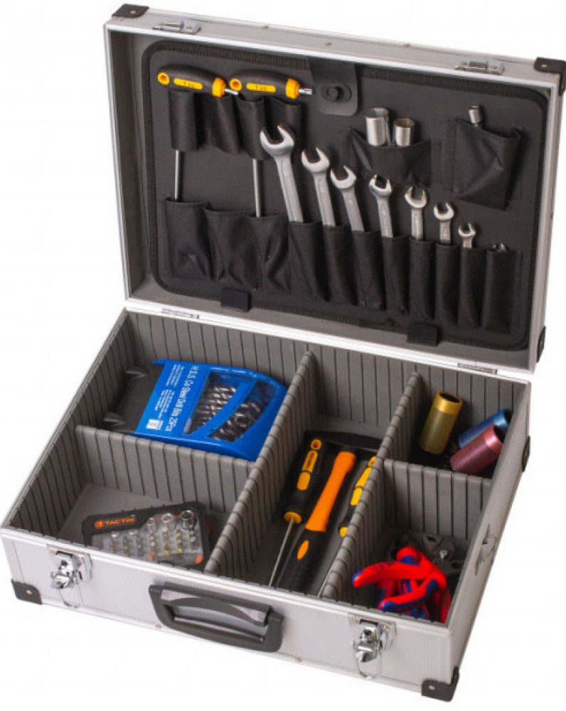 Kapsy u vyjímatelné desky jsou nejvhodnější na skladování různých druhů klíčů, nástavců, atd. Do skladovacího prostoru si můžete uložit např.: kladivo, své oblíbené šroubováky nebo kleště, různé nástrčné klíče či sadu bitů a vrtáků.