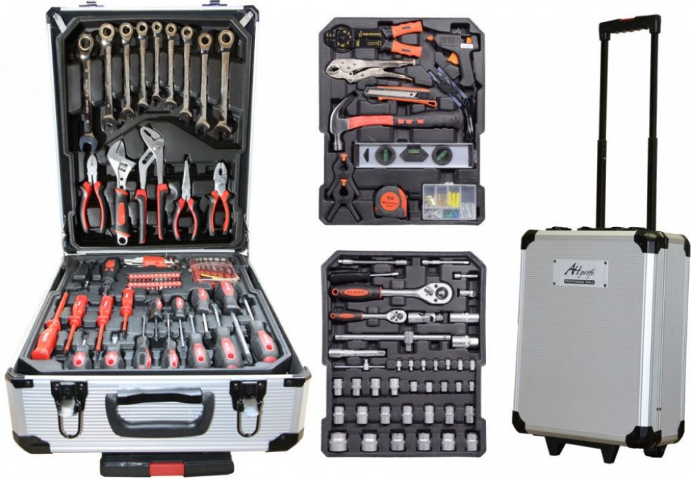 - Sada obsahuje celou řadu kleští, šroubováků, gola klíčů, kladivo, vodováhu, stranové i imbus klíče, bity, základní spojovací materiál a další nářadí, které je vhodné pro použití jak doma, v garáži, tak i na cestách.