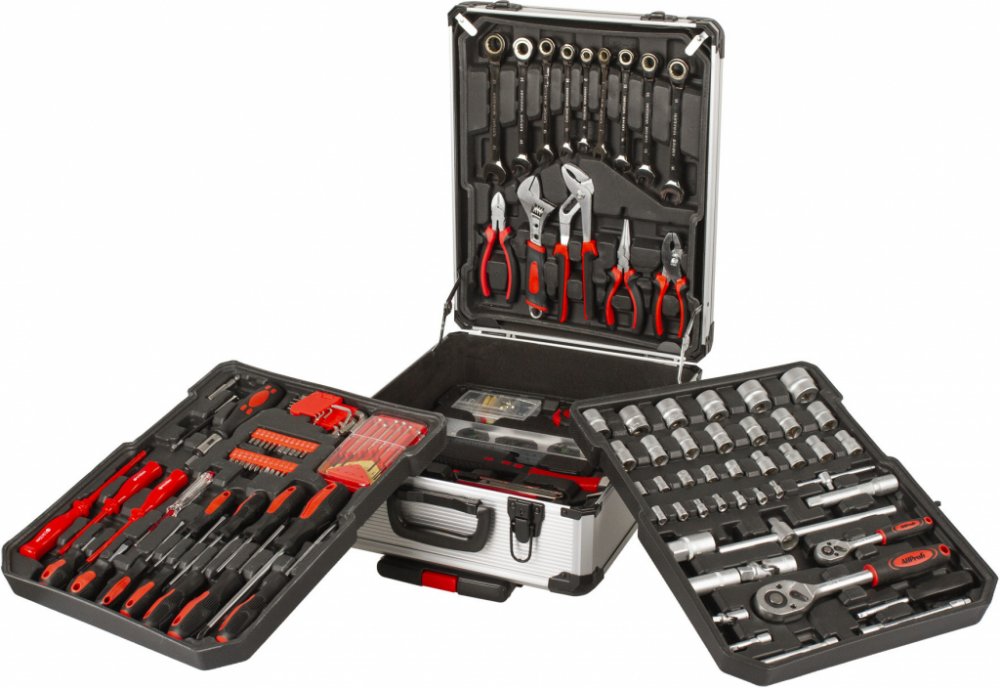 Kompaktní sada ručního nářadí se skládá ze 187 dílů včetně samotného hliníkového kufru. Nářadí je vyrobeno ze slitiny Cr-V a je prakticky uložené ve 4 plastových platech, které můžete vyjmout a v případě potřeby přenést na místo montáže pouze potřebné nářadí. Toto uložení zrychluje orientaci v nářadí, šetří Váš čas, usnadňuje práci a zaručuje perfektní přehled o chybějícím nářadí.