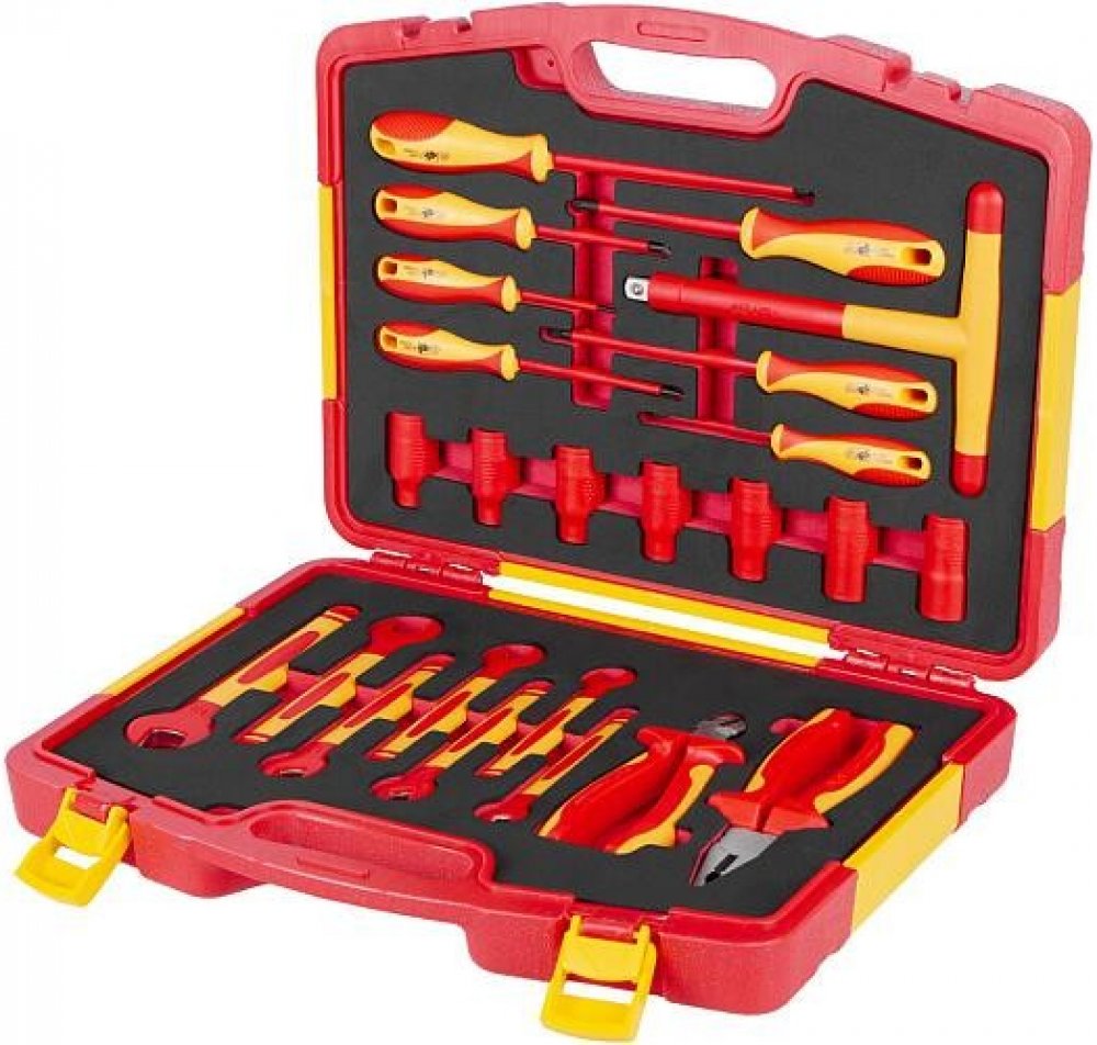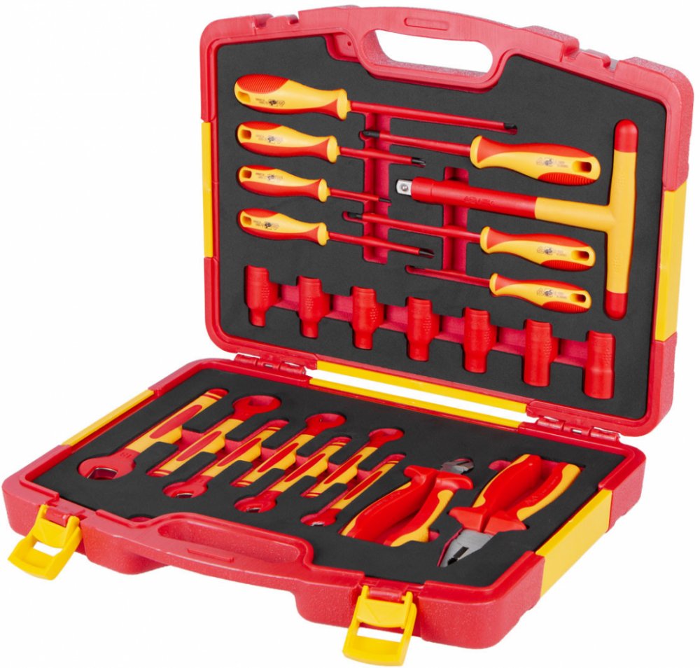 Komplexní sada VDE nářadí s plochými klíči, šroubováky, hlavicemi i kleštěmi, bezpečně uložená v plastovém kufru s tvarovanou pěnovou výplní.