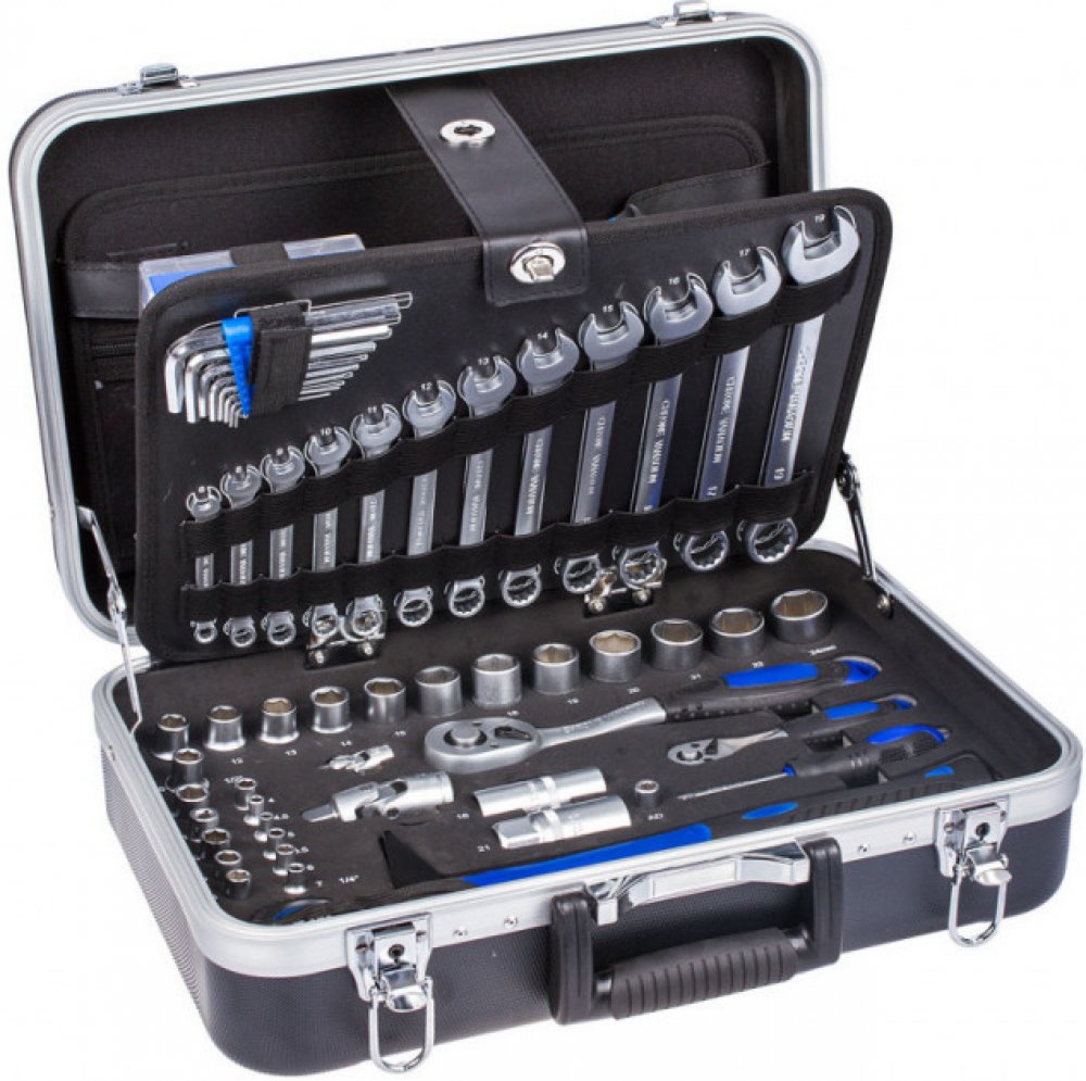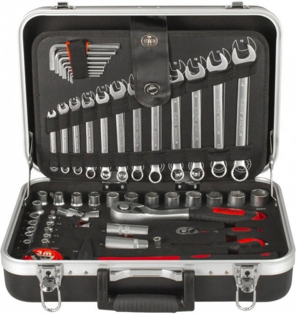 Nedocenitelný pomocník na montáže nebo do dílny, když potřebujete přenášet nářadí z místa na místo – kufr a 105 dílů nářadí!Plastový pevný kufr je vyztužen hliníkovým rámem, který zajistí lepší přiléhavost při uzavření. Příjemně tvarované madlo zajistí pohodlné držení a kufr tak můžete nosit stále s sebou.Uvnitř kufru se nachází několik sad profesionálního nářadí. Nářadí je vyrobeno ze slitiny Cr-V a jeho ergonomické rukojeti jsou příjemně pogumované, takže nekloužou, padnou do každé ruky a zajistí pohodlný úchop.Nářadí je v kufru prakticky uloženo ve čtyřech platech, která zaručí rychlejší orientaci v nářadí, zjednoduší práci a zajistí perfektní přehled o chybějícím nářadí.Obsah kufru:13 ks nástrčných klíčů 1/2": 10, 11, 12, 13, 14, 15, 17, 18, 19, 20, 21, 22, 24 mm1 ks prodlužovací nástavec 1/2" x 125 mm1 ks kloubový nástavec 1/2"2 ks nástrčné klíče na svíčky: 1/2" x 16, 21 mm1 ks ráčna, 72 zubů, 1/2"11 ks nástrčných klíčů 1/4": 4, 4.5, 5, 5.5, 6, 7, 8, 9, 10, 11, 12 mm2 ks prodlužovací nástavce 1/4" 50 a 100 mm1 ks kloubový nástavec 1/4"1 ks nástavec 1/4"1 ks šroubovák na bity 1/4"1 ks ráčna, 72 zubů, 1/4"1 ks zámečnické kladivo, 300 g1 ks svinovací metr 3 m1 ks Sika kleště 250 mm1 ks kombinované kleště 175 mm1 ks půlkulaté rovné kleště 150 mm1 ks štípací boční kleště 150 mm31 ks bitů + 1 ks magnetického držáku4 ks šroubováků: