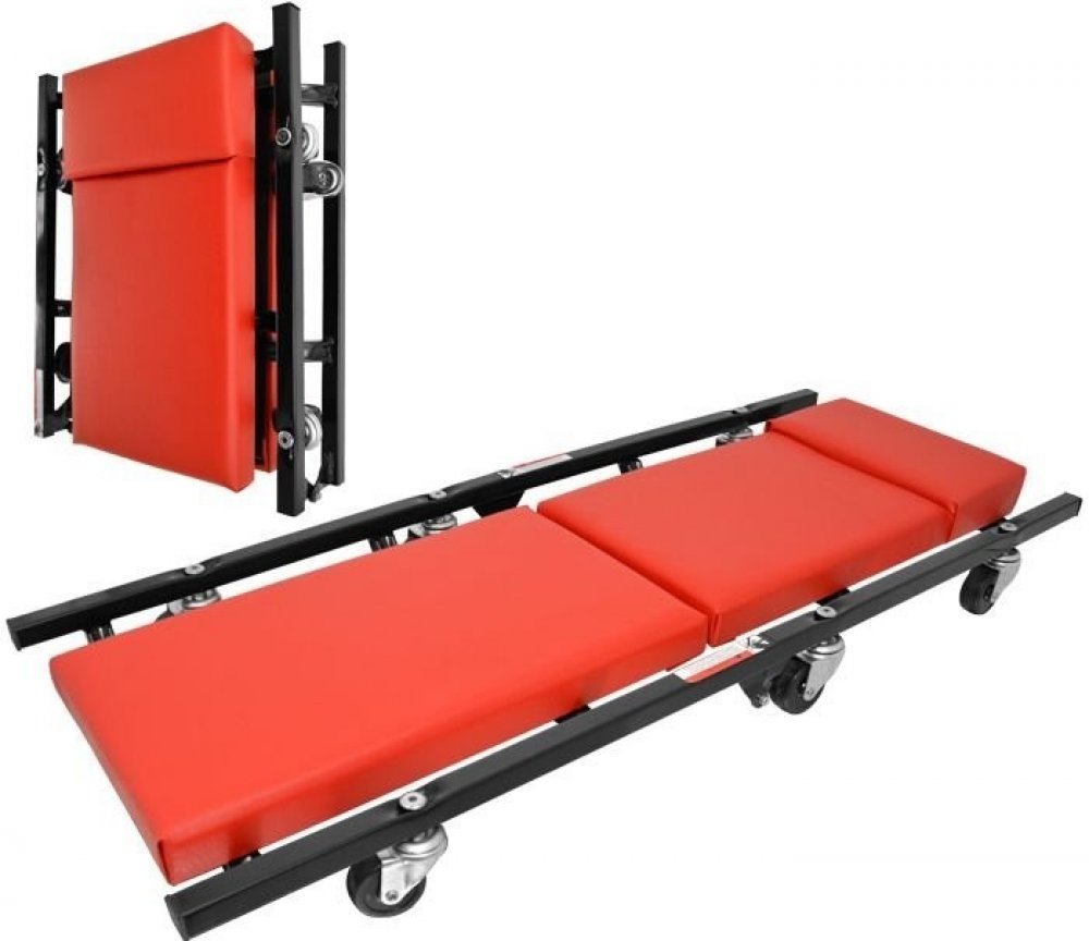 Skládací pojízdné montážní lehátko s vinylovým čalouněním, se 6 otočnými nylonovými kolečky v kuličkových ložiskách a s masivním kovovým rámem má rozměry 920 x 380 x 95 mm. praktické skládací pojízdné montážní lehátko, umožňující pohyb např. pod stojícím nebo jen mírně nadzvednutým vozidlem ve výšce jen cca 10 cm nad podlahou kvalitní čalounění vinylovou koženkou snadná údržba, omyvatelný povrch robustní kovová konstrukce 6 otočných koleček z vysoce odolného nylonu uložených v kuličkových ložiskách celkové rozměry: 920 x 380 x 95 mm nosnost: 100 kg kvalita a provozní spolehlivost